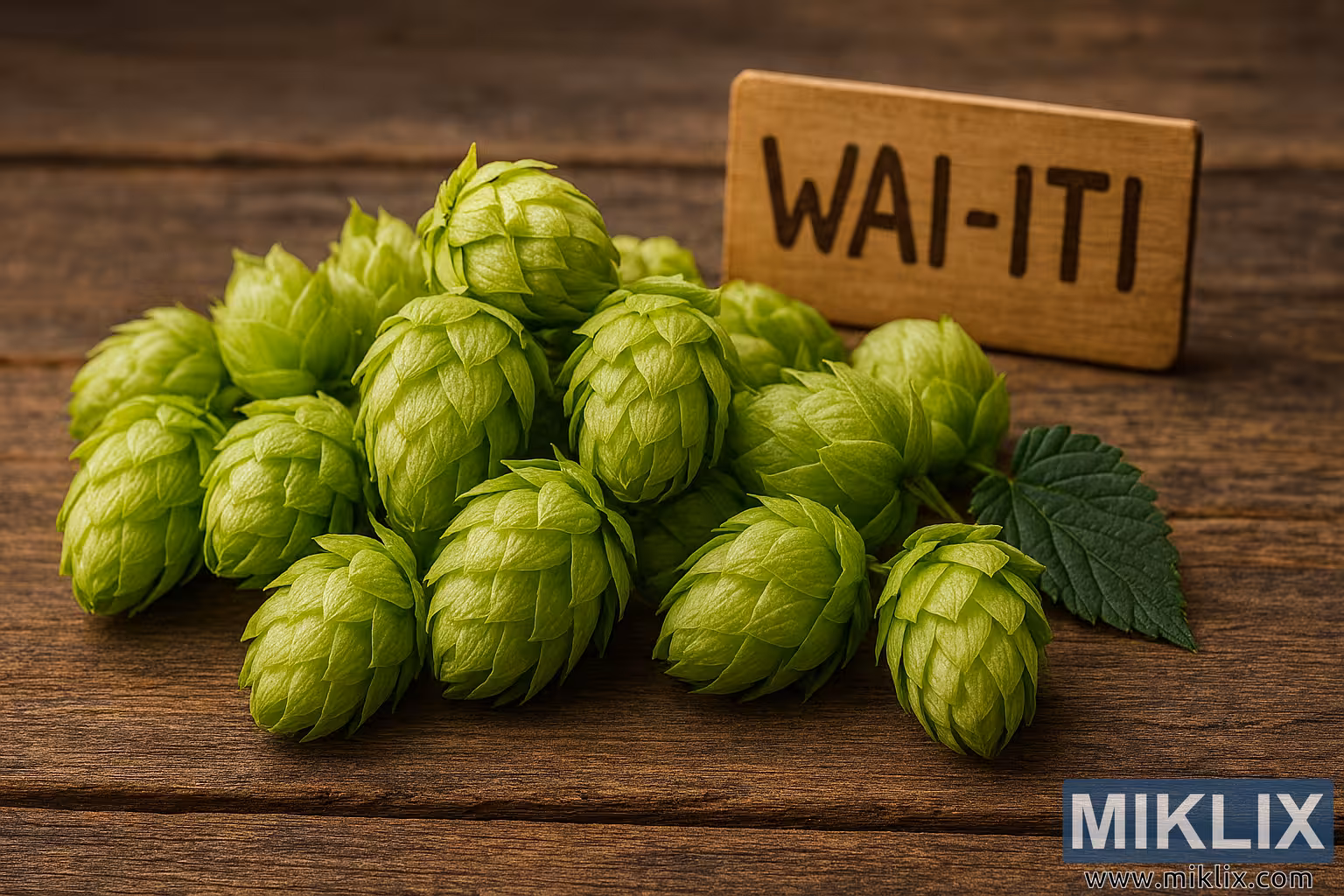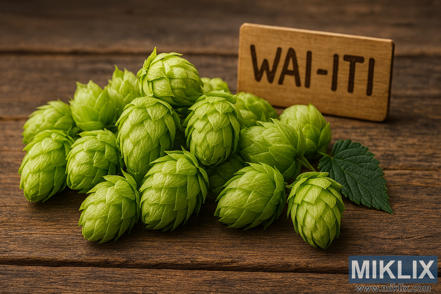 Lighting in the image is soft and diffused, likely natural daylight, casting gentle shadows that emphasize the three-dimensional form of the hop cones and the texture of the wood. The shallow depth of field ensures that the hop cones and the "WAI-ITI" sign are in sharp focus, while the background remains subtly blurred, drawing the viewer’s attention to the central subject. The composition is balanced and inviting, ideal for use in brewing catalogs, educational materials, or promotional content celebrating artisanal hops and craft beer ingredients.