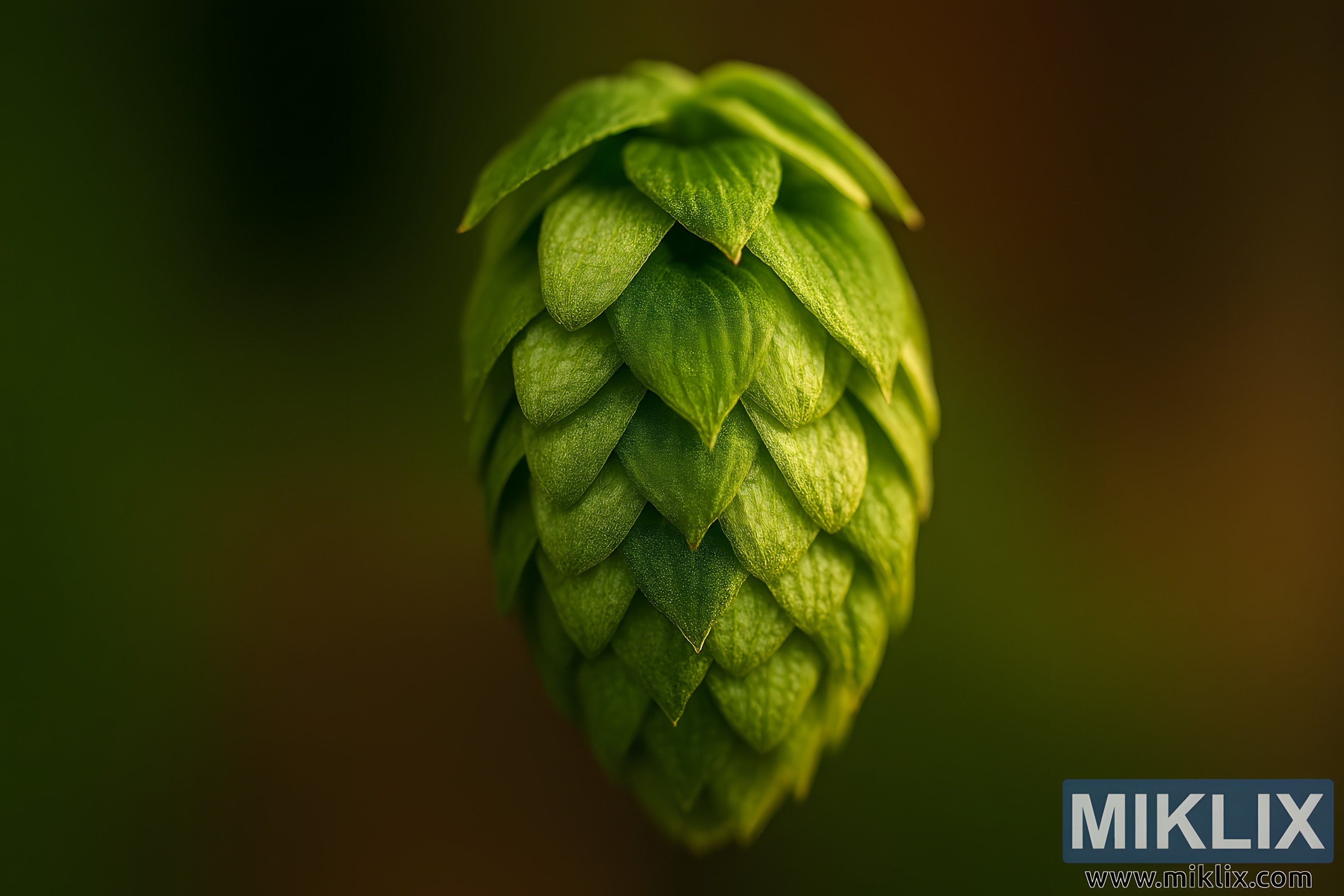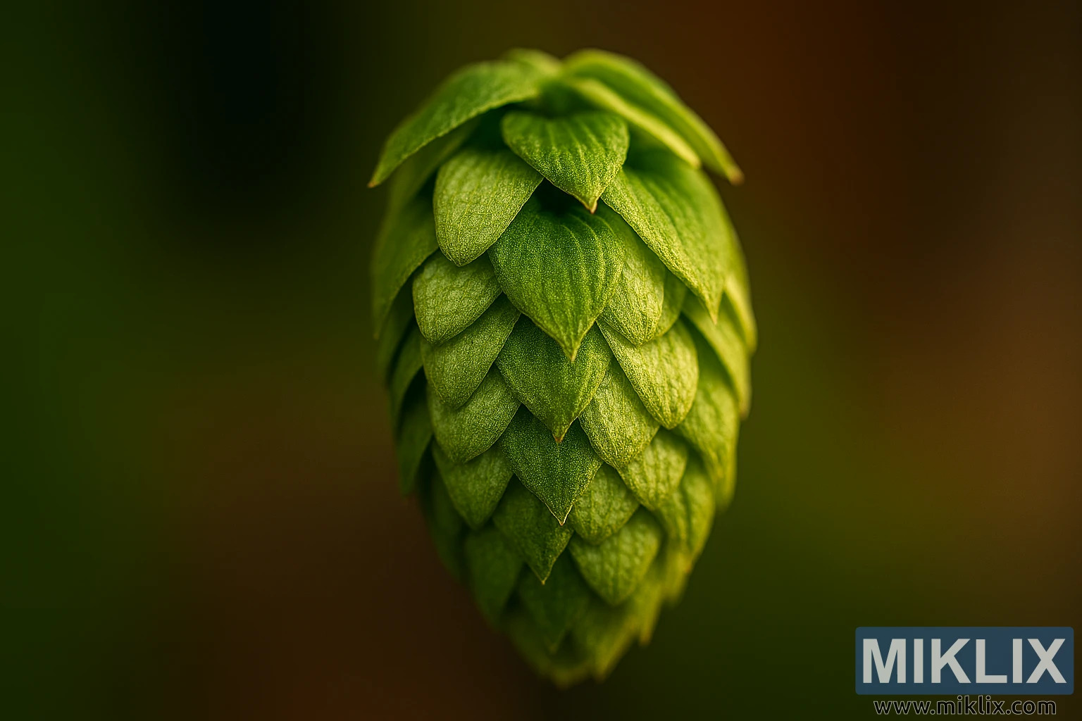 The hop cone itself is a vibrant green, with tightly packed bracts forming a conical shape reminiscent of a miniature pine cone. Each bract is delicately veined, with edges that curl slightly outward, revealing the layered complexity of the cone’s anatomy. A fine layer of trichomes gives the surface a soft, almost plush appearance, hinting at the aromatic oils contained within—those citrusy, piney, and herbal notes that define the Waimea variety.