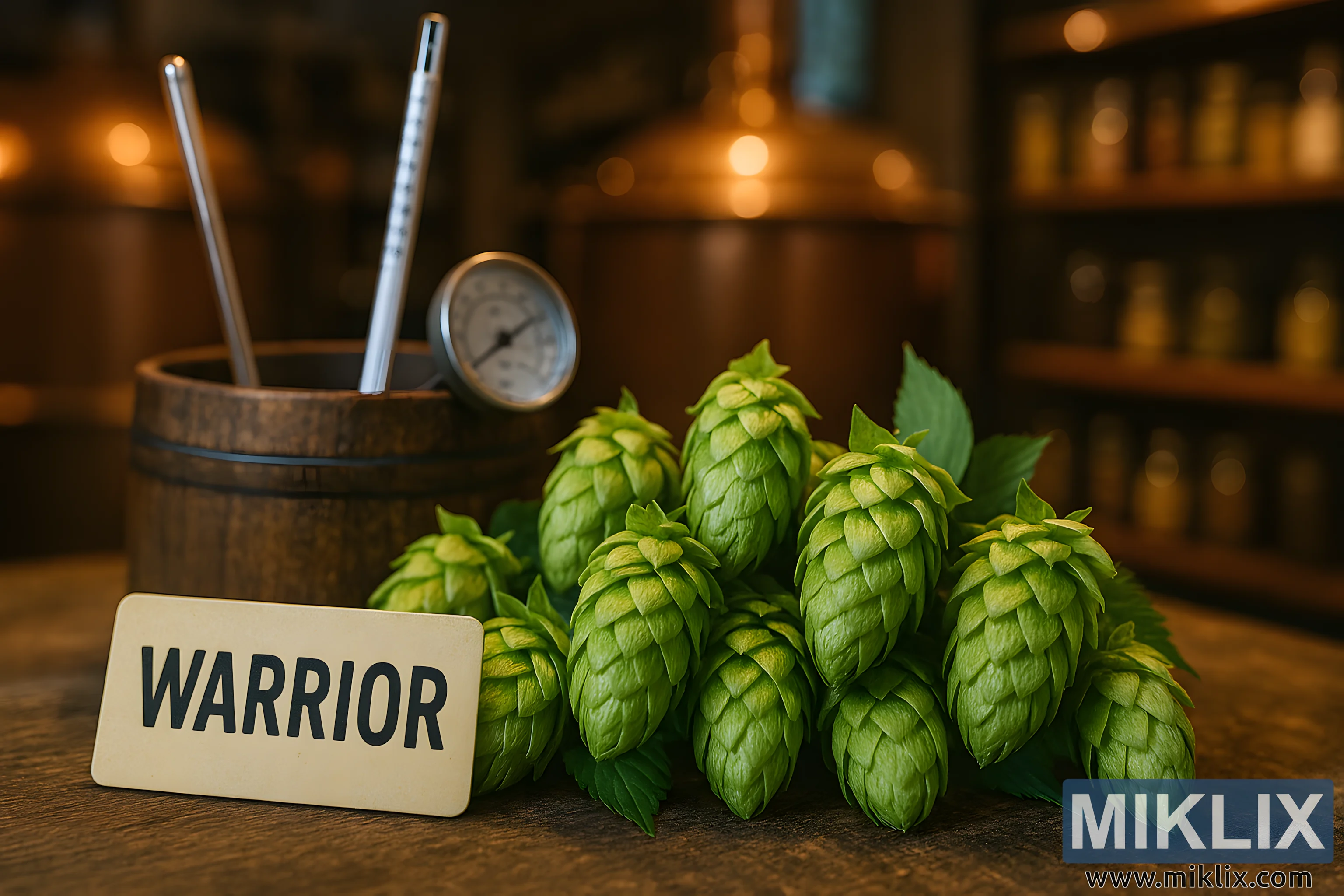 Nestled among the hops is a small, rectangular sign labeled "WARRIOR" in bold, black capital letters on a cream-colored background, reinforcing the varietal identity. Just behind this focal point, a beautifully aged wooden barrel serves as a container for essential brewing tools. The barrel’s warm brown tones and visible wood grain evoke a sense of rustic craftsmanship. Inside, a slender glass hydrometer leans gently against the rim, its calibrated scale visible through the transparent tube. Beside it, a round-faced brewing thermometer with a white dial and black markings peeks out, its needle poised to measure precision. These tools subtly underscore the technical care involved in the brewing process.