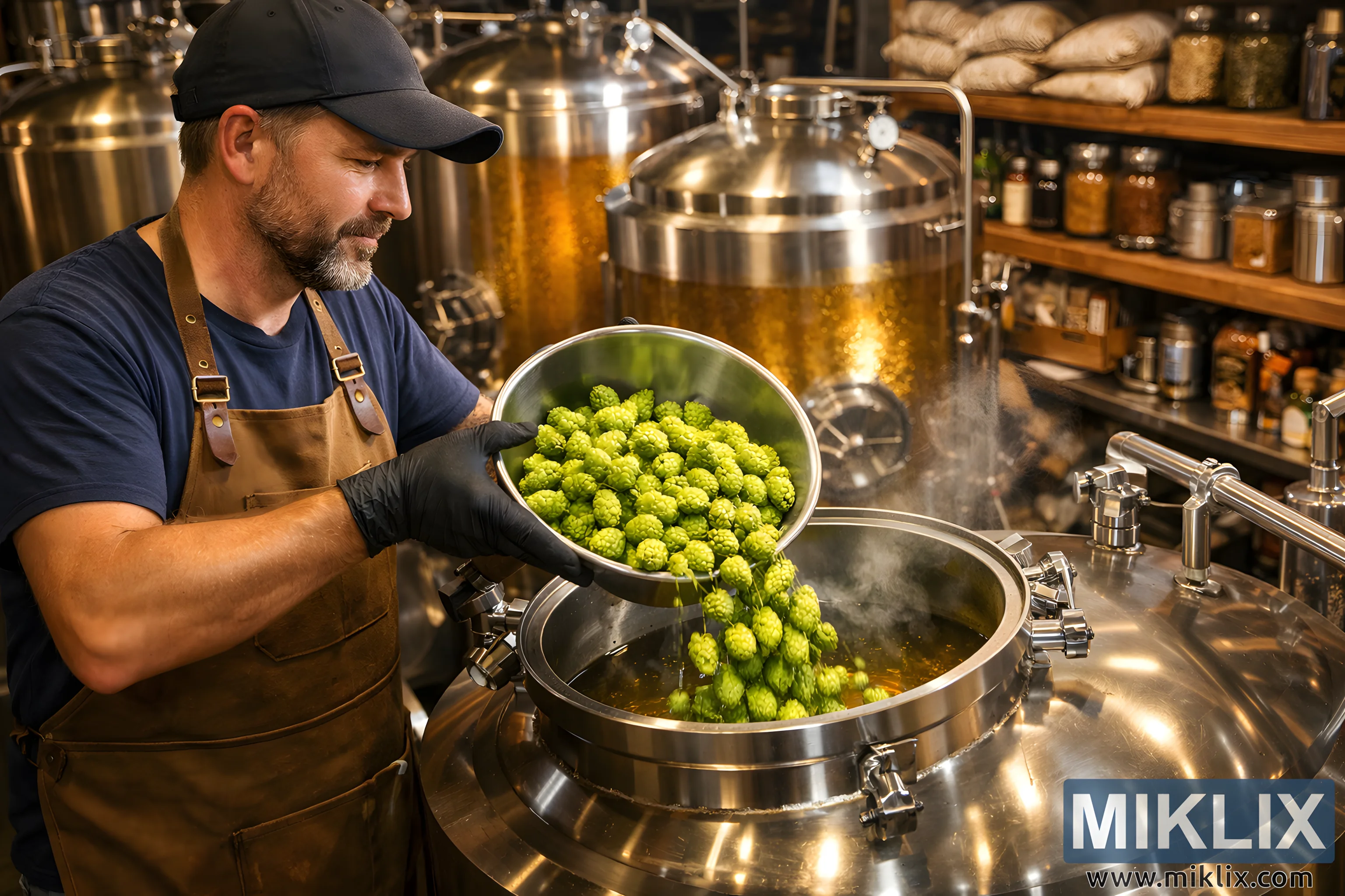 A detailed brewery scene showing a skilled brewer dry hopping with fresh green hops, surrounded by gleaming fermenters and warm, artisanal lighting.