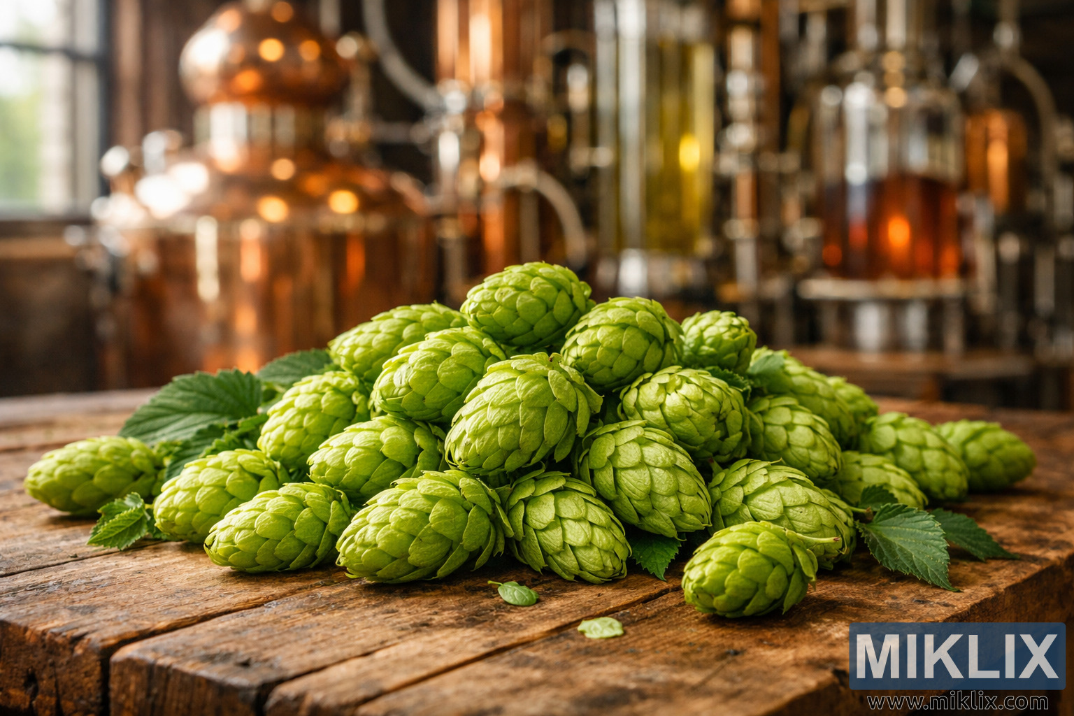 In the background, the image transitions smoothly into a shallow depth of field. The brewing and distillation equipment is intentionally out of focus, providing context without distracting from the hops. Gleaming copper vessels, polished pipes, and sections of glass apparatus catch the light, producing warm highlights and soft reflections. The copper tones echo the warmth of the wooden table, visually tying the background to the foreground while subtly suggesting a professional brewing or distillation environment. The blurred forms imply cleanliness, precision, and craftsmanship, characteristics associated with high-quality brewing operations.