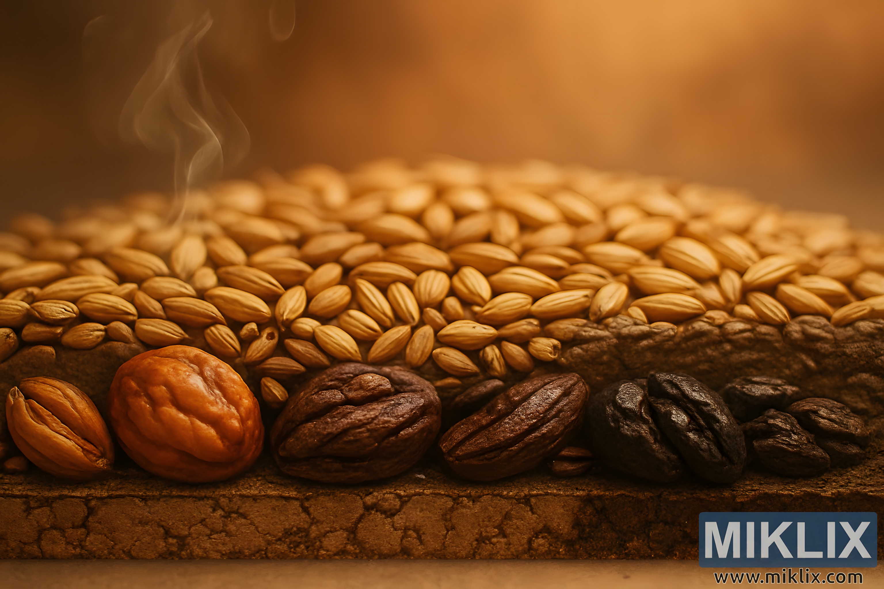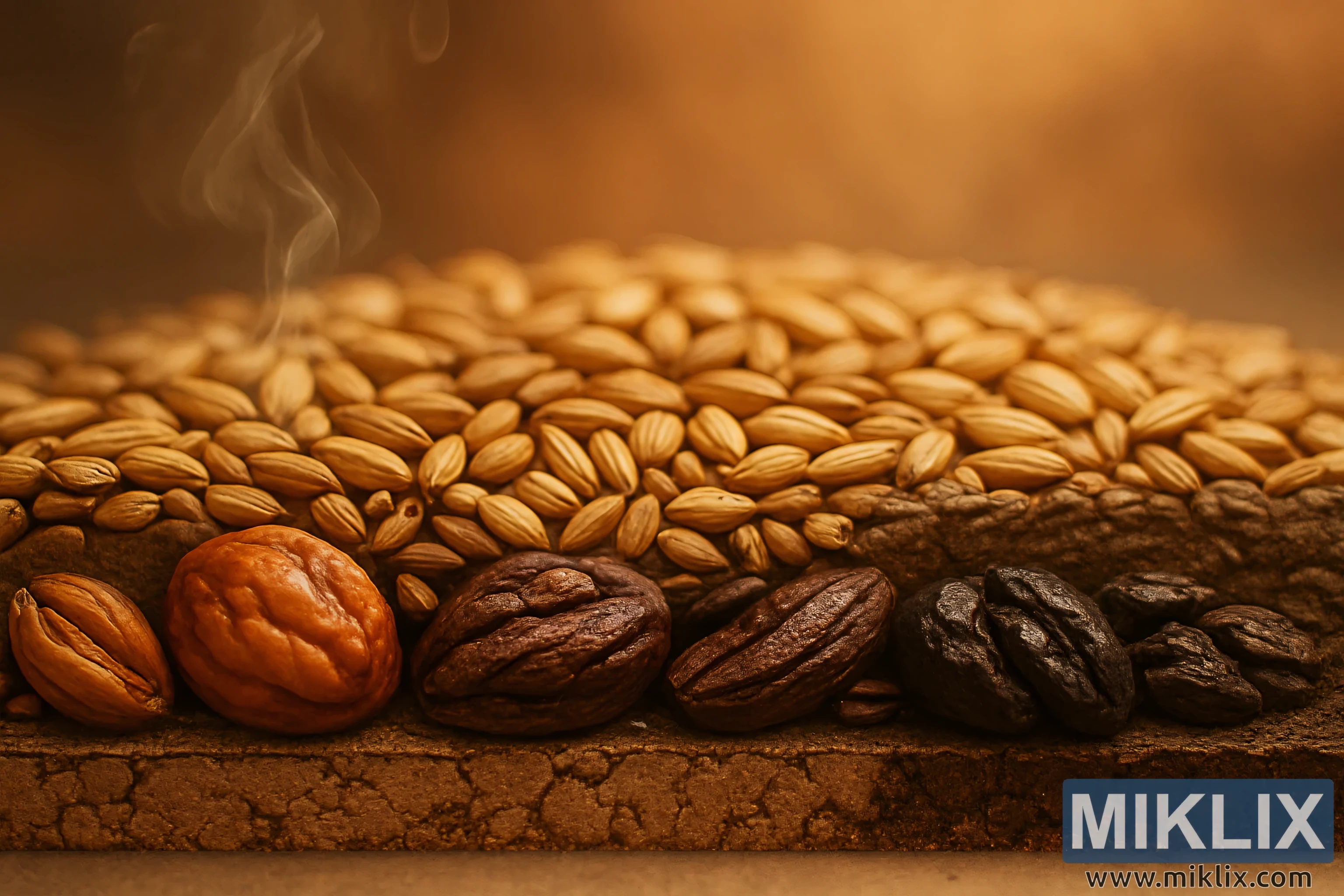 In this richly composed image, the viewer is invited into a tactile and aromatic exploration of malt in its many forms. The scene unfolds like a cross-sectional study of brewing’s most foundational ingredient, where texture, color, and implied aroma converge to tell a story of transformation and flavor. The foreground is dominated by a dense, visually arresting layer of dark roasted malts—glossy, oval-shaped grains that range in tone from deep espresso to near-black. Their surfaces shimmer under warm, diffused lighting, revealing subtle ridges and curves that speak to the intensity of their roast. These grains evoke the bold, smoky character of chocolate stouts and robust porters, their appearance alone suggesting notes of burnt sugar, bitter cocoa, and charred wood. Wisps of steam rise gently from the surface, adding motion and atmosphere, as if the grains are still warm from the kiln.