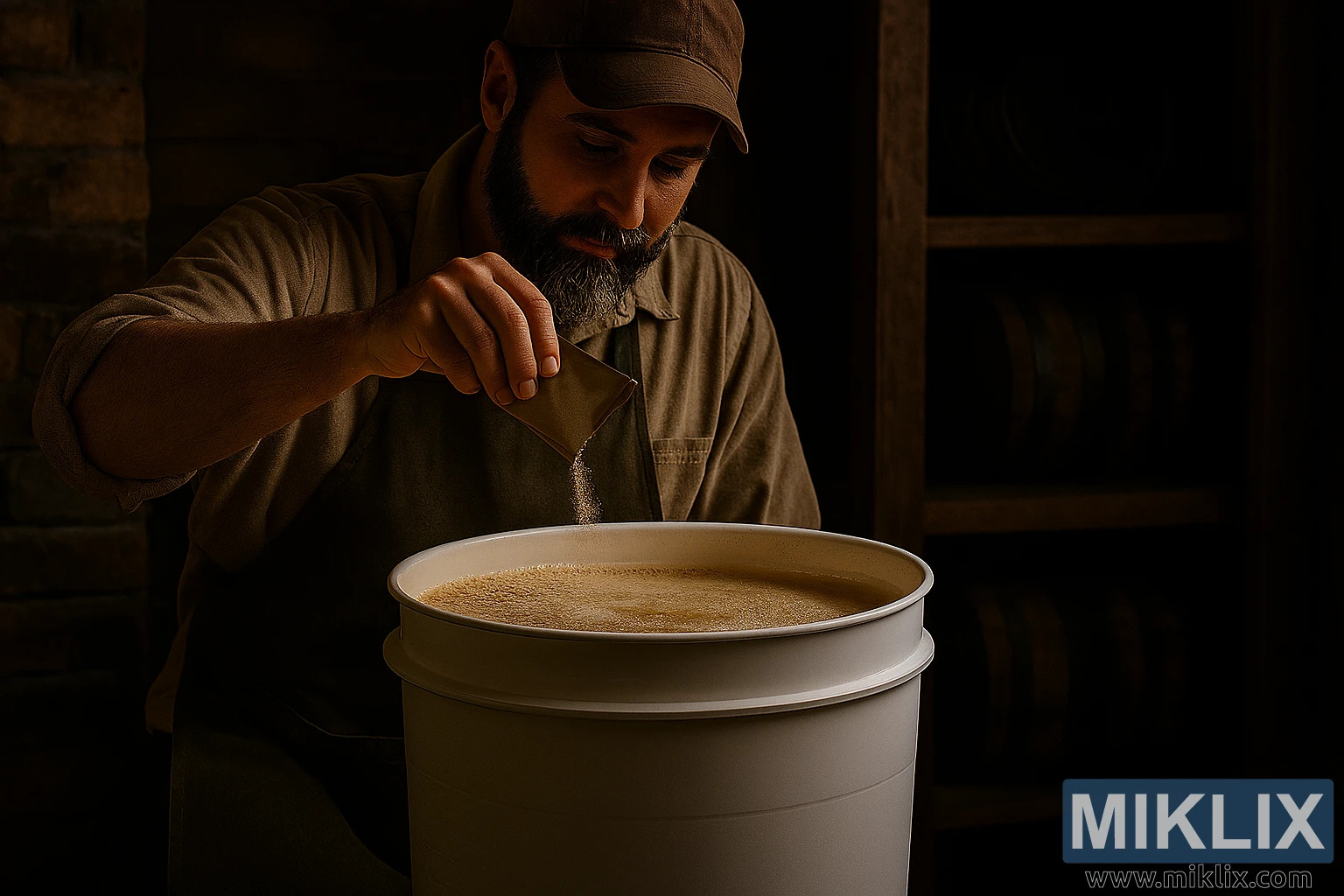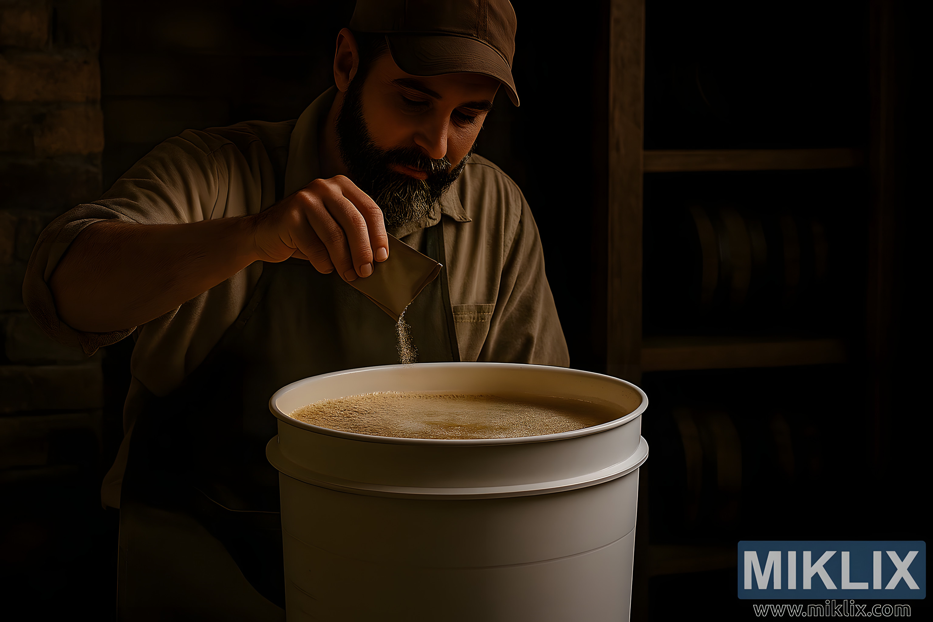 Image: Homebrewer Pitching Yeast in Rustic Fermentation Scene