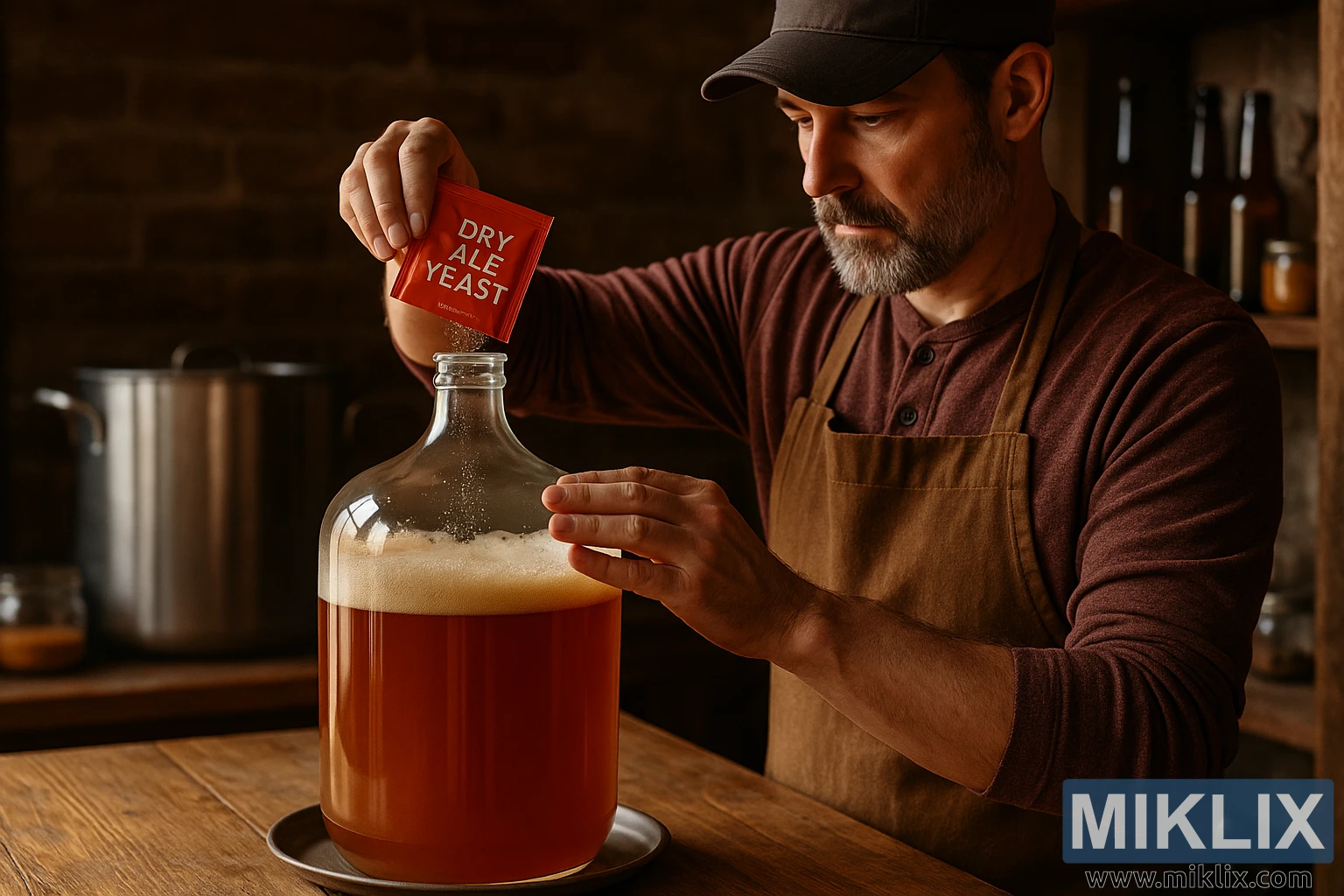 A focused homebrewer pitches dry ale yeast into a fermenter filled with amber wort in a cozy, rustic brewing environment, highlighting the craft of making beer at home.