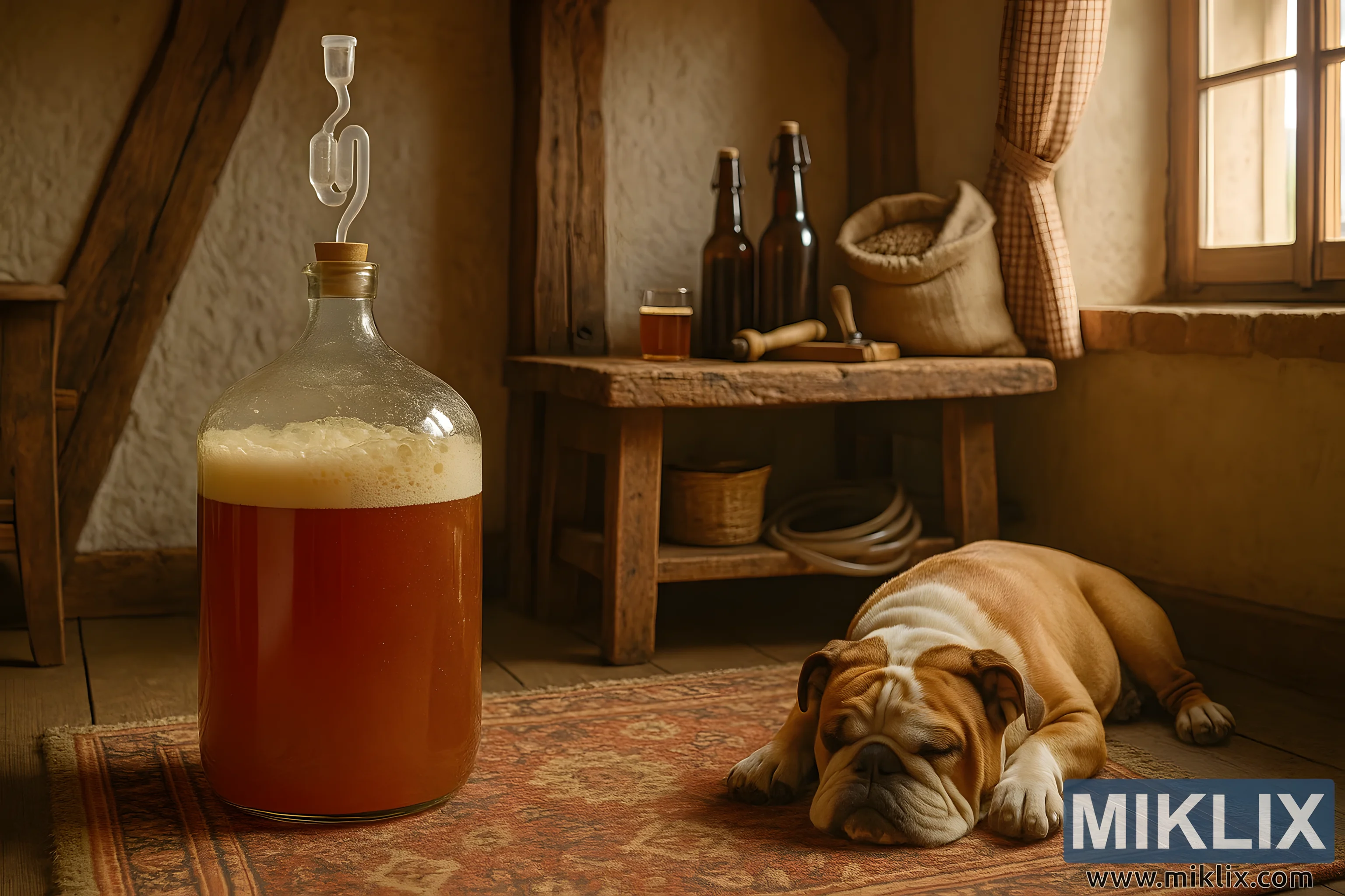 A cozy European home brewing scene featuring a glass carboy of fermenting ale, rustic wooden furnishings, and a bulldog sleeping peacefully on a patterned rug.