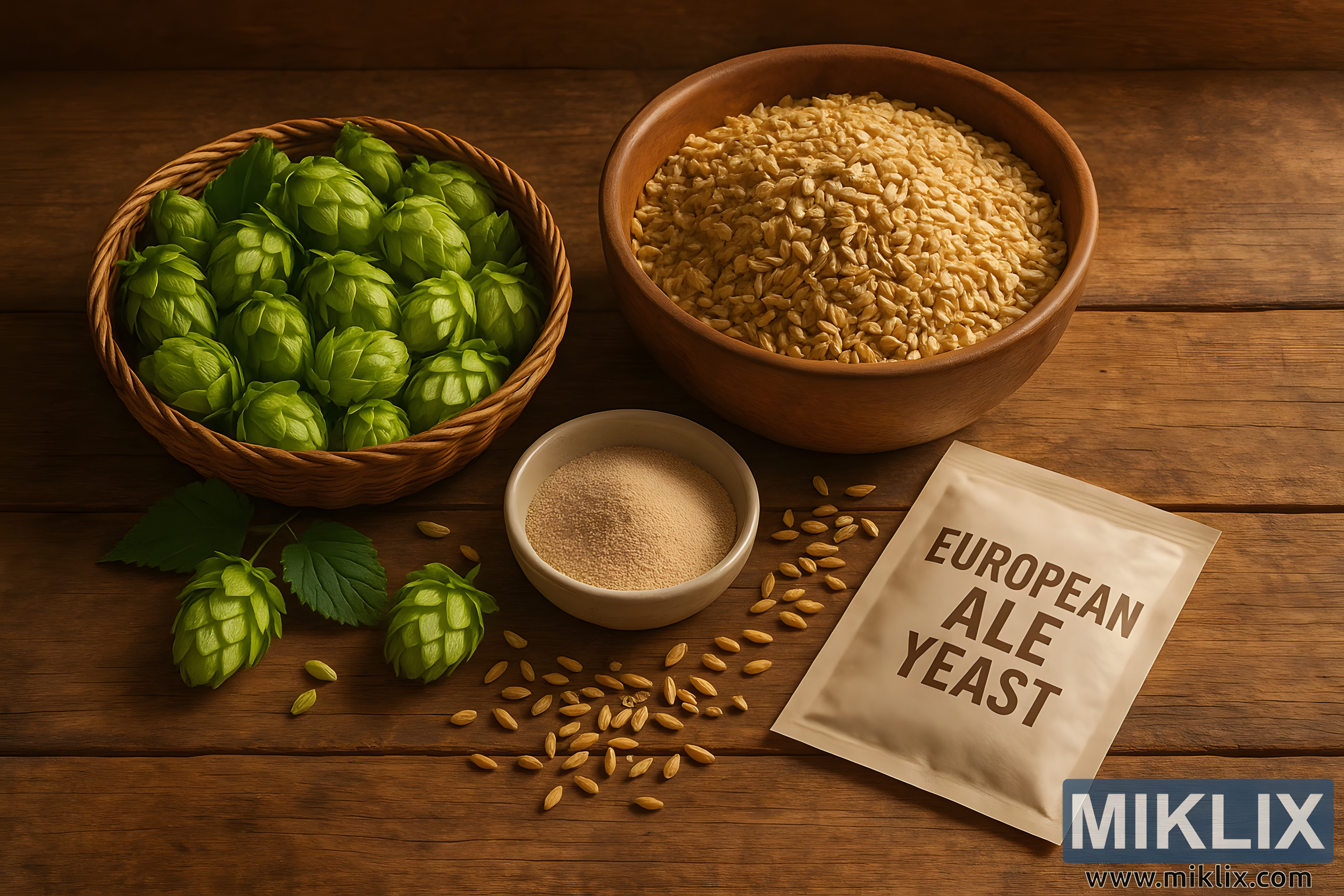 Ultimately, the composition is both educational and evocative: it highlights the three central pillars of brewing—grain, hops, and yeast—while situating them within a rustic, timeless aesthetic. It conveys not just what is necessary to create a European-style ale but also the sensory richness, tradition, and care embedded in the process. One can almost imagine the earthy scent of the hops, the nutty sweetness of the barley, and the subtle tang of the yeast—sensations waiting to be unlocked in the brewing journey that lies ahead.