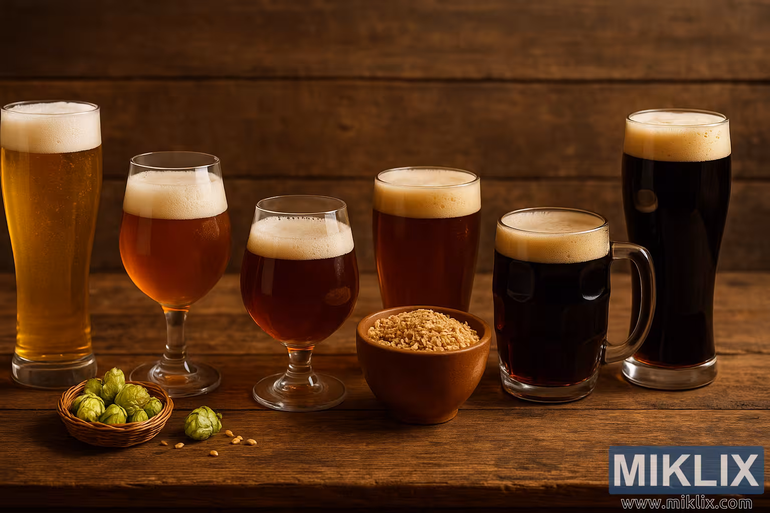 An inviting display of European ales, from golden blondes to rich dark stouts, showcased in assorted glasses on a rustic wooden table with hops and malt.