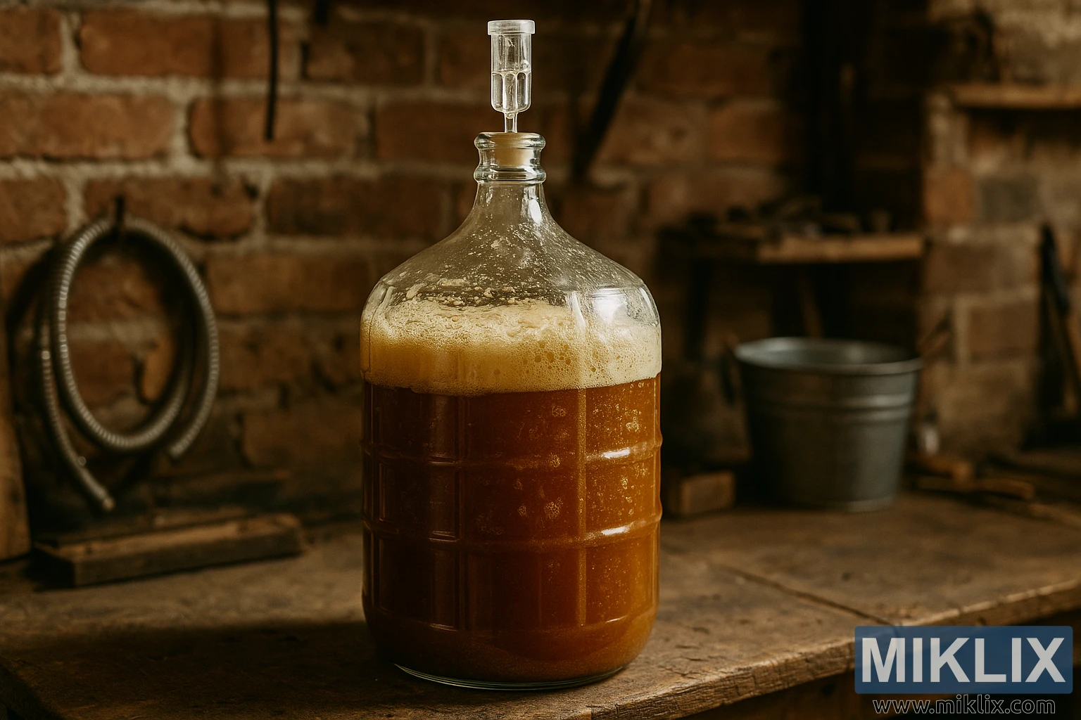 Color plays a central role in the image’s atmosphere. The amber of the beer is deep and glowing, complemented by the surrounding palette of browns, coppers, and golds. These hues, combined with the dim yet warm lighting, create a nostalgic, almost cinematic mood reminiscent of traditional craftsmanship. The interplay between light and shadow emphasizes texture: the slightly rough surface of the glass carboy, the coarse brick behind it, and the aged patina of the wooden workbench. Each element contributes to the authenticity and realism of the composition.