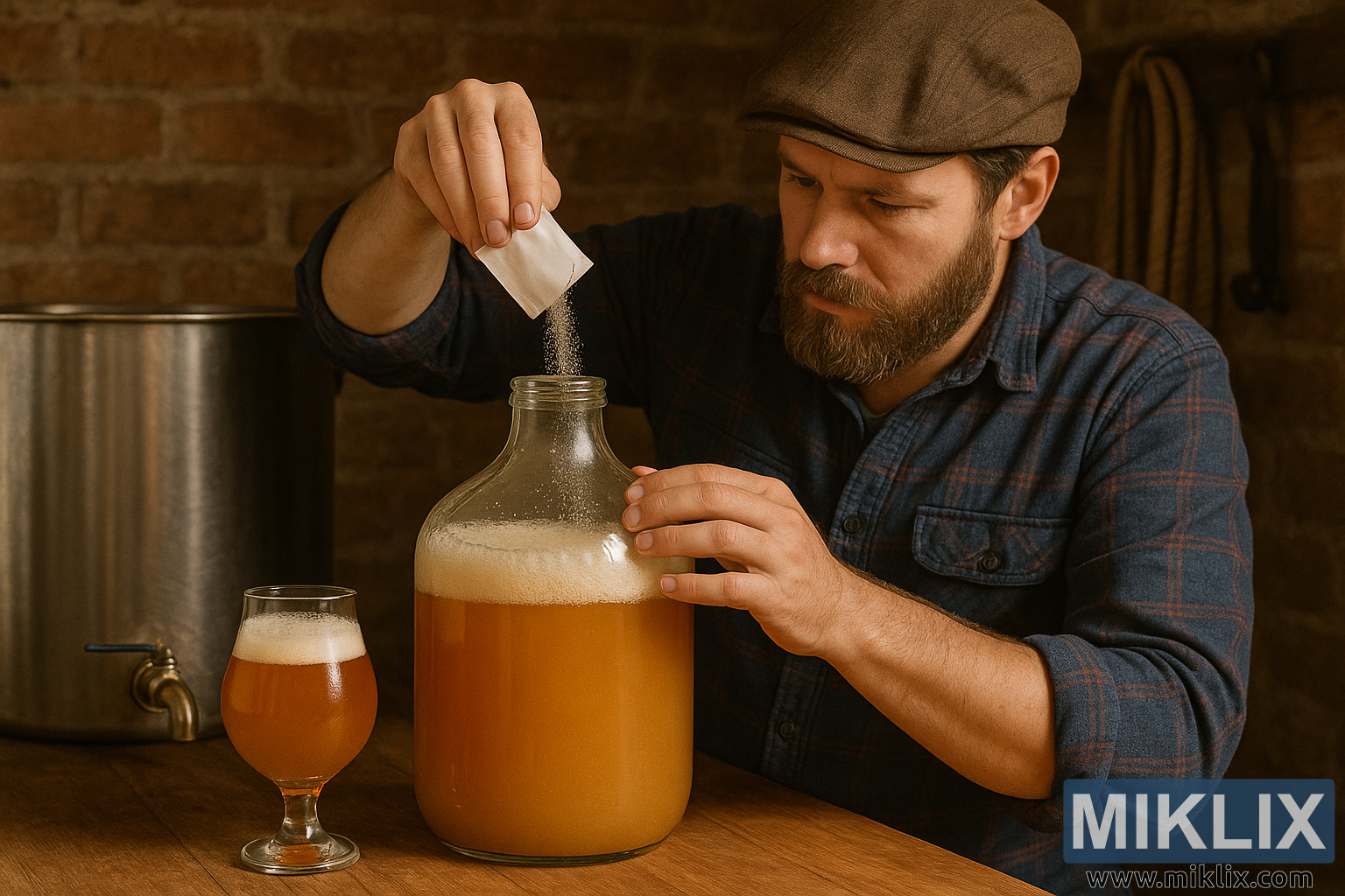 A homebrewer dry-pitches yeast into a Belgian saison inside a rustic fermentation setup, surrounded by warm lighting, wooden surfaces, and brewing equipment.