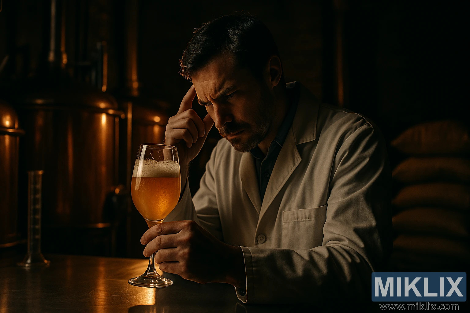 A contemplative brewer in a lab coat examines a glass of fermenting beer under warm task lighting. Copper brewing vessels and malt sacks set the backdrop, highlighting troubleshooting in the fermentation process.
