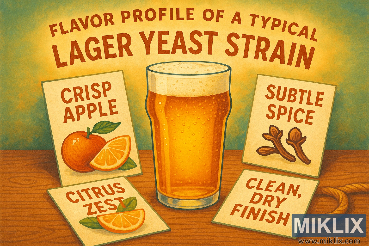 Taken together, the composition manages to balance artistry and clarity. It conveys a scientific message—highlighting the sensory impact of lager yeast—while presenting it in a format that is accessible, engaging, and even nostalgic. The deliberate use of warm colors, simple illustrations, and rustic textures communicates the approachable charm of modern lager brewing. It captures not only the literal tasting notes of crisp apple, citrus zest, subtle spice, and a clean finish, but also the intangible qualities of balance, refreshment, and timeless appeal that define lagers as a style.