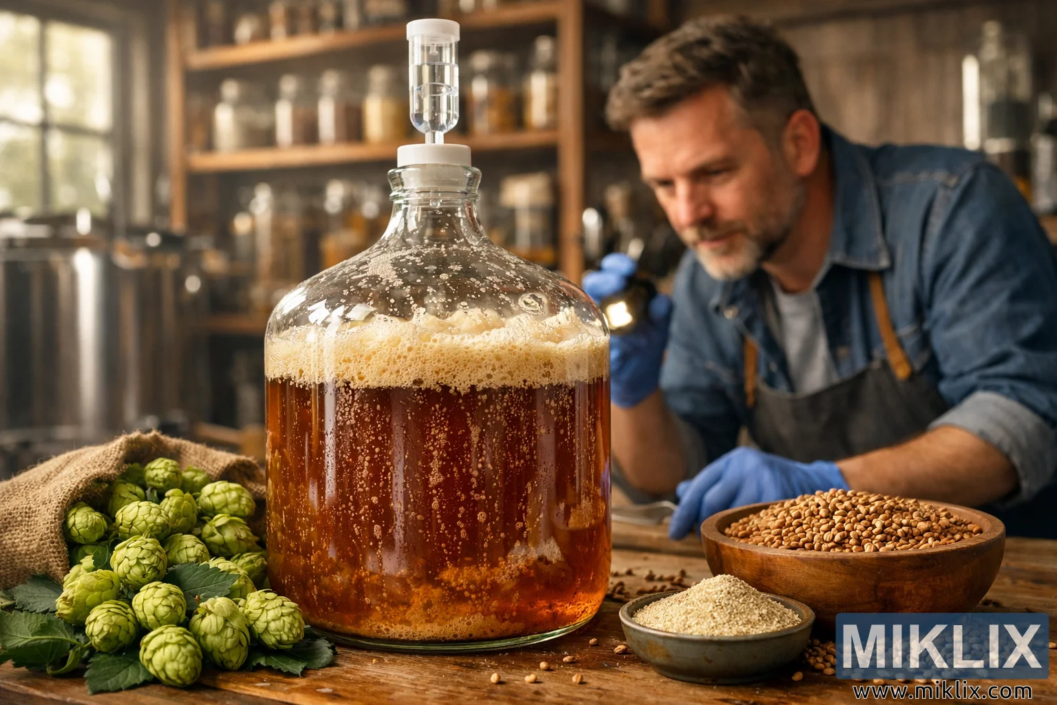 A detailed brewery scene showing beer fermentation in a glass carboy, fresh hops, malted barley, and a skilled brewer, highlighting craftsmanship, yeast, and traditional brewing.