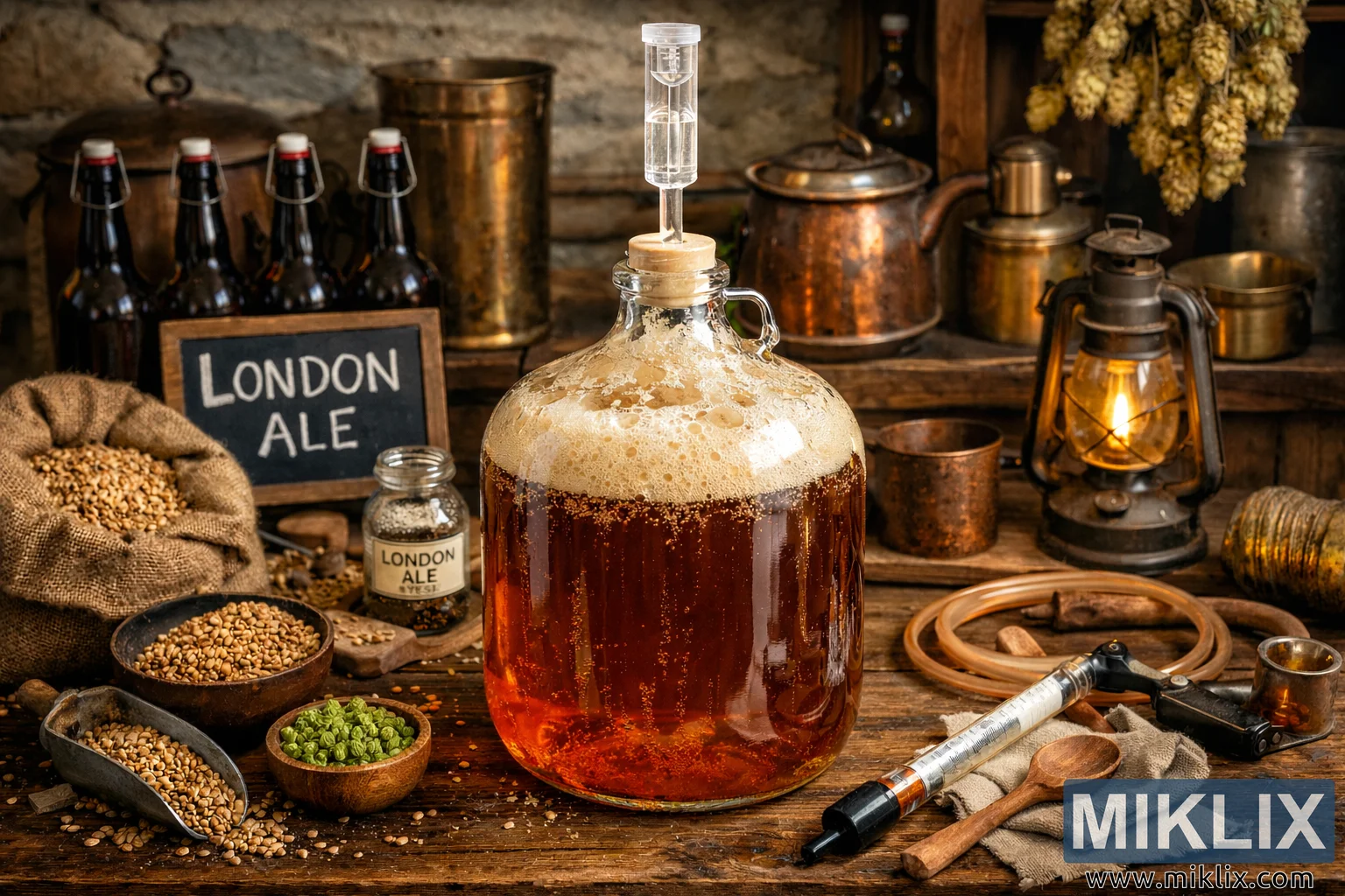 A rustic English homebrewing scene featuring an amber London Ale fermenting in a glass carboy with a properly fitted clear airlock, surrounded by malted barley, hops, copper brewing vessels, bottles, tubing, and warm lantern light.