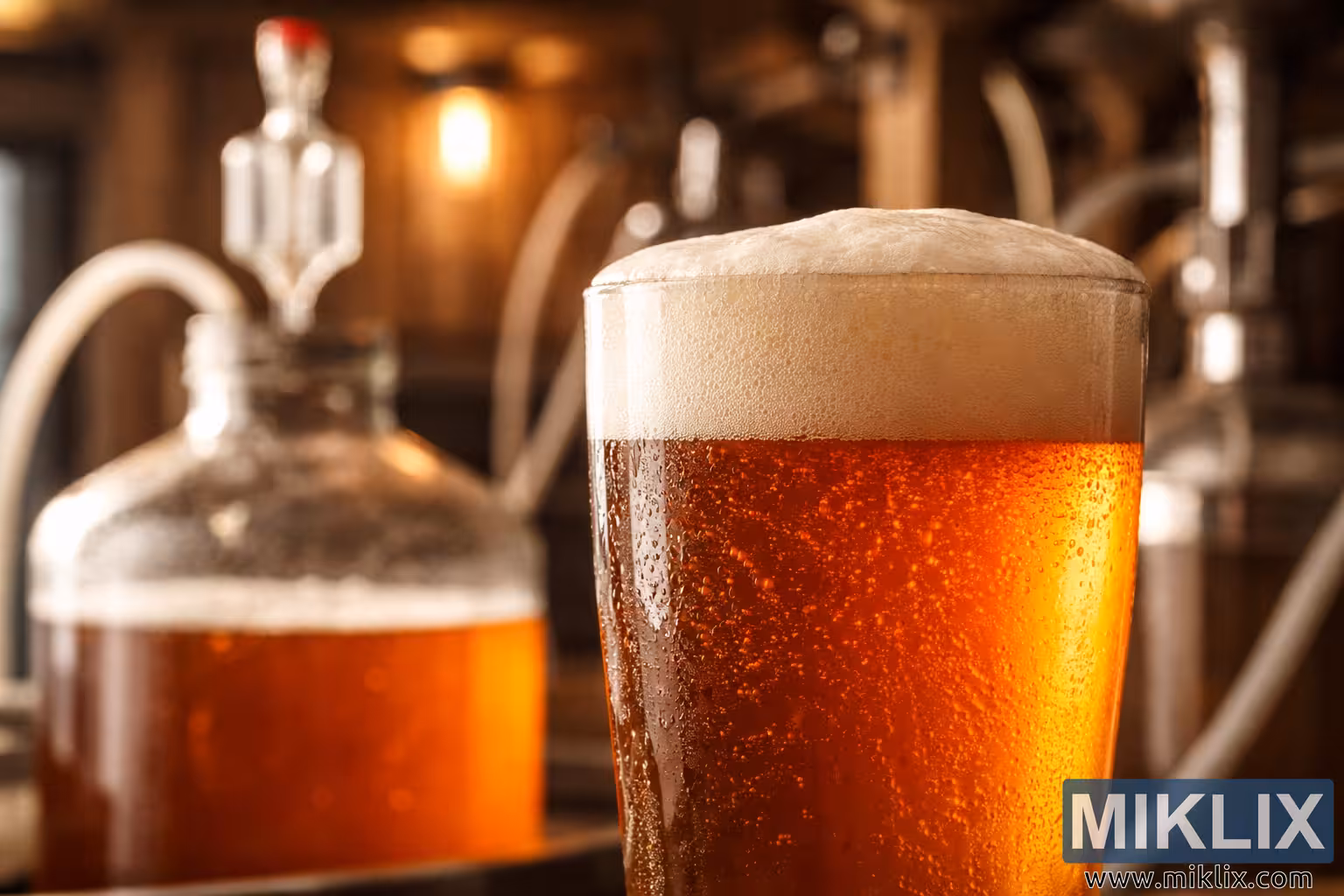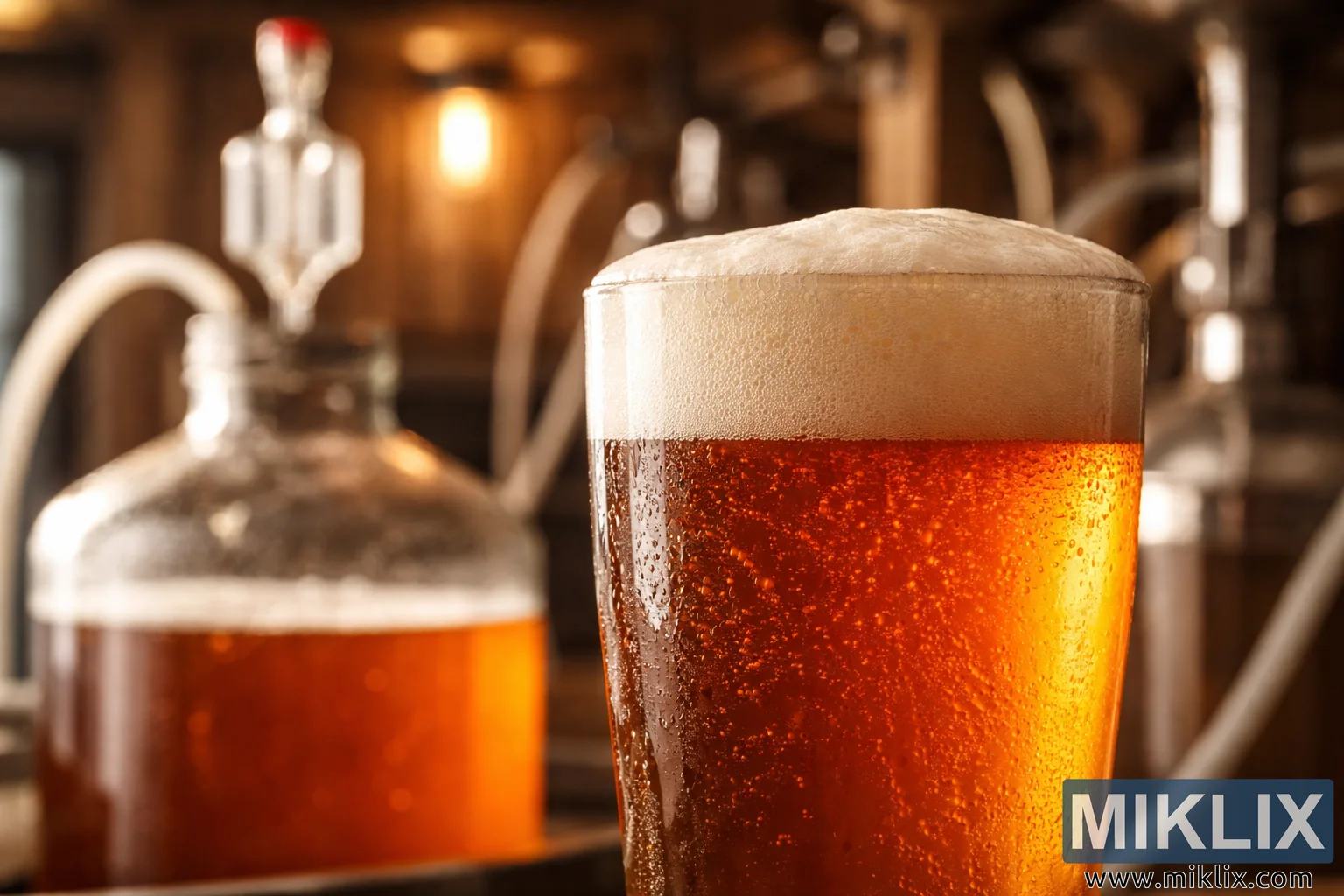 High-resolution landscape image of a clear amber craft beer with creamy foam, fine carbonation, and condensation on the glass, set against softly blurred homebrewing equipment in warm light.
