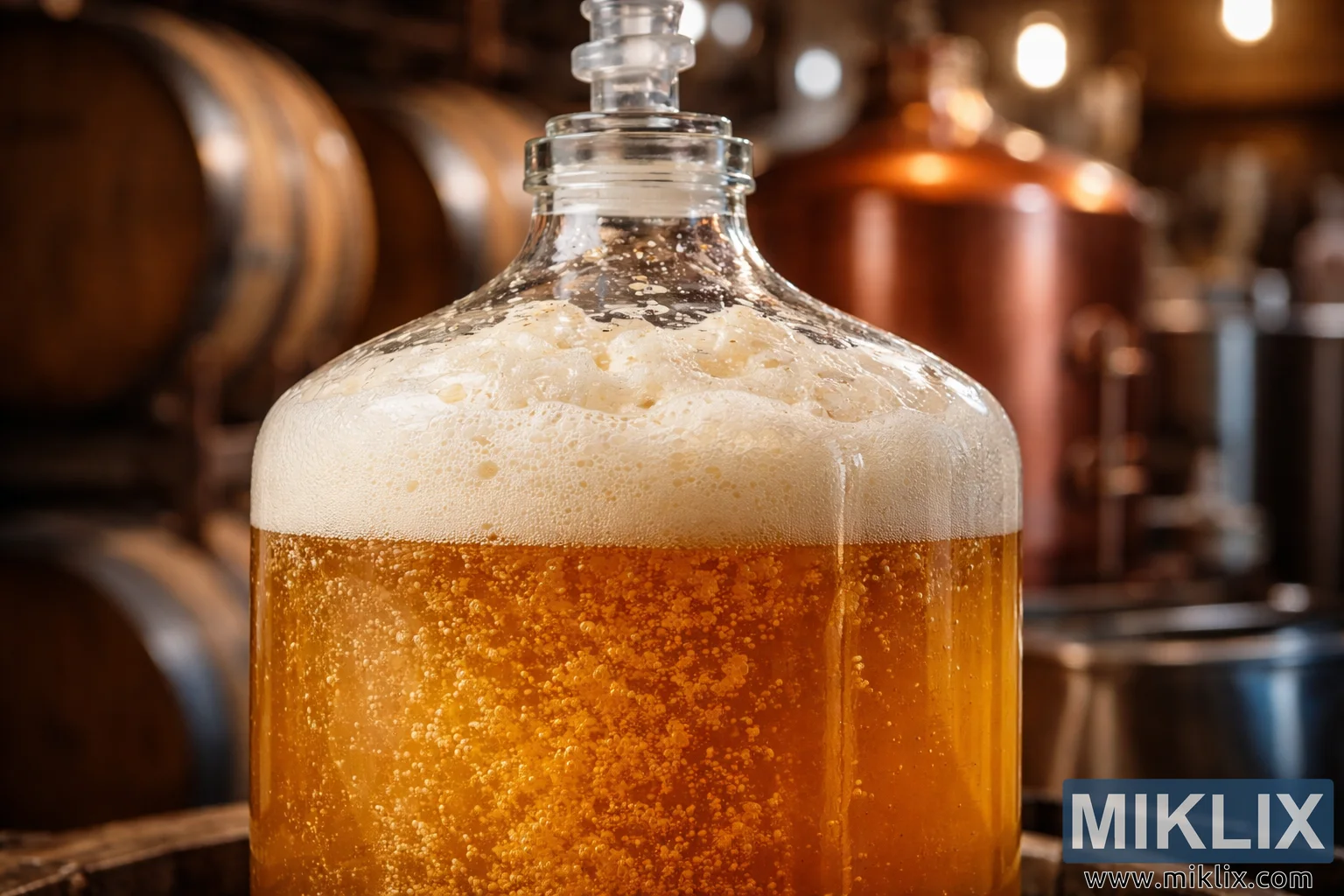 High-resolution landscape image of a glass carboy filled with actively fermenting golden beer, bubbles rising beneath a foamy head, set in a warm brewery environment with wooden barrels and copper kettles.