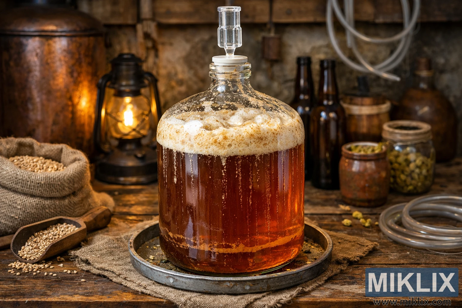 The image depicts a traditional homebrewing scene centered on a large, clear glass carboy filled with fermenting Burton ale. The carboy sits solidly on a rustic, weathered wooden table, its surface marked by scratches, stains, and the patina of long use, reinforcing the handcrafted, old-world atmosphere. Inside the carboy, the ale glows a deep amber to copper-brown color, illuminated by warm ambient light. A thick, creamy foam krausen crowns the liquid, clinging to the inside of the glass and forming irregular, frothy textures that clearly signal active fermentation. Tiny bubbles rise through the beer, subtly distorting the view through the curved glass walls. At the top of the carboy, a white rubber stopper holds a transparent airlock partially filled with liquid, capturing escaping carbon dioxide and visually emphasizing the brewing process in motion. The surrounding environment enhances the sense of a traditional homebrew workspace. Behind the carboy, a softly glowing oil lantern casts a warm, golden light, creating gentle highlights on the glass and reflections across the beer’s surface. Nearby, a large copper kettle with a dulled, timeworn finish rests against a rough wooden backdrop, suggesting repeated use over many brewing sessions. Burlap sacks filled with pale malted barley sit open on the table, with individual grains scattered casually across the wood, adding texture and realism to the scene. To one side, several dark brown glass bottles stand upright, empty and waiting, while small jars containing hops or brewing ingredients introduce green and earthy tones that contrast with the amber beer. Coiled clear tubing lies nearby, reinforcing the practical, hands-on nature of the setup. The background consists of rough-hewn wooden planks and brewing tools, all slightly out of focus, ensuring the carboy remains the visual focal point. Overall, the image conveys warmth, craftsmanship, and tradition, capturing a quiet moment in the homebrewing process where time, patience, and natural fermentation transform simple ingredients into beer.
