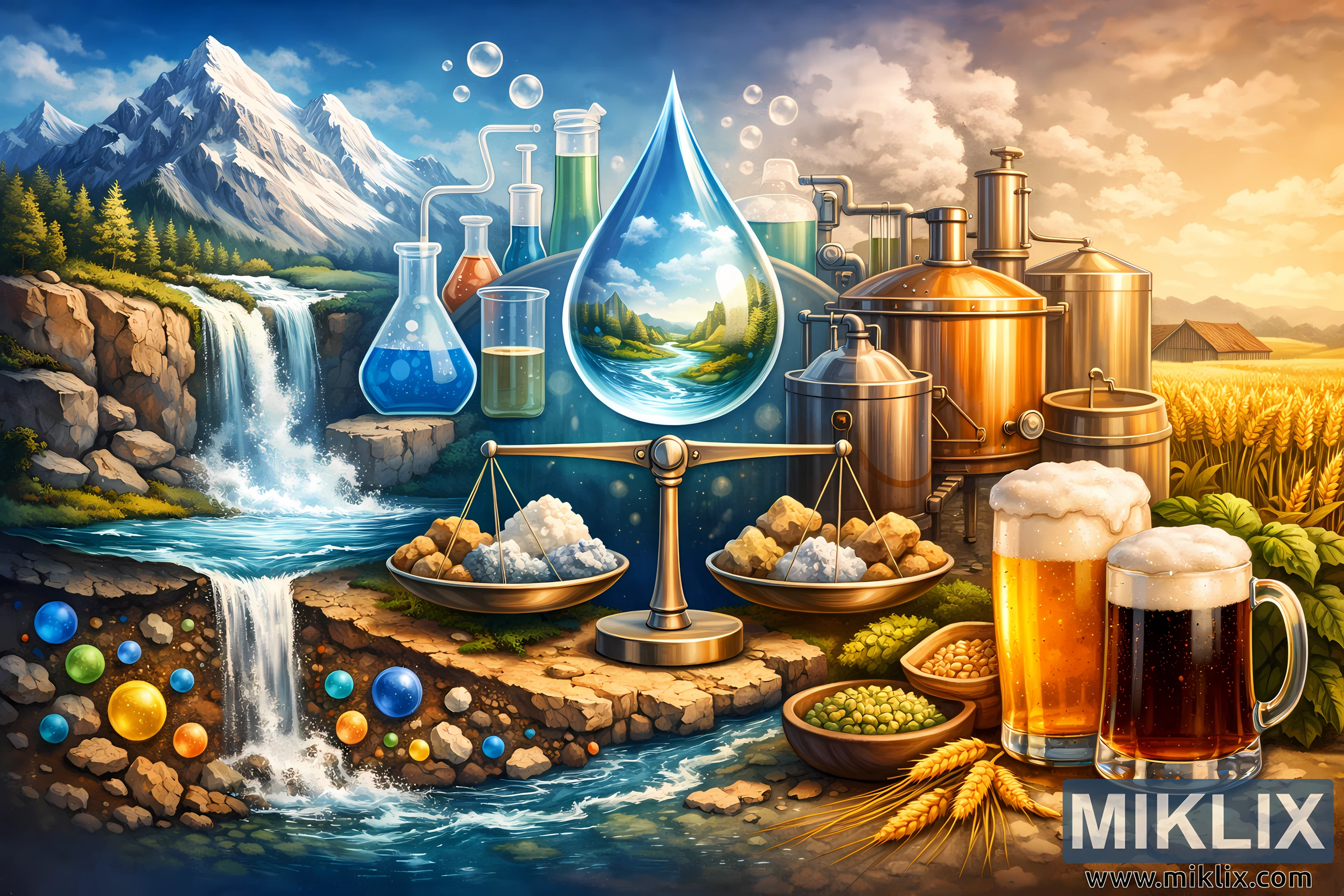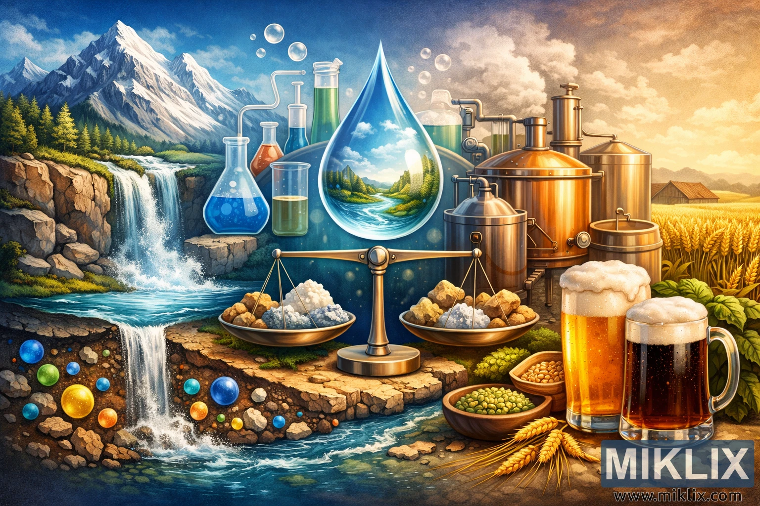 An artistic, text-free illustration visualizing how water composition influences beer brewing, from natural sources and minerals to brewing equipment and finished beer.