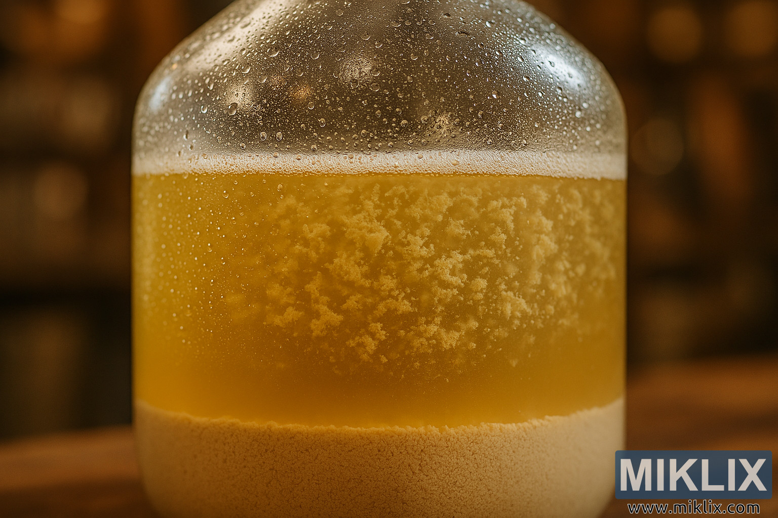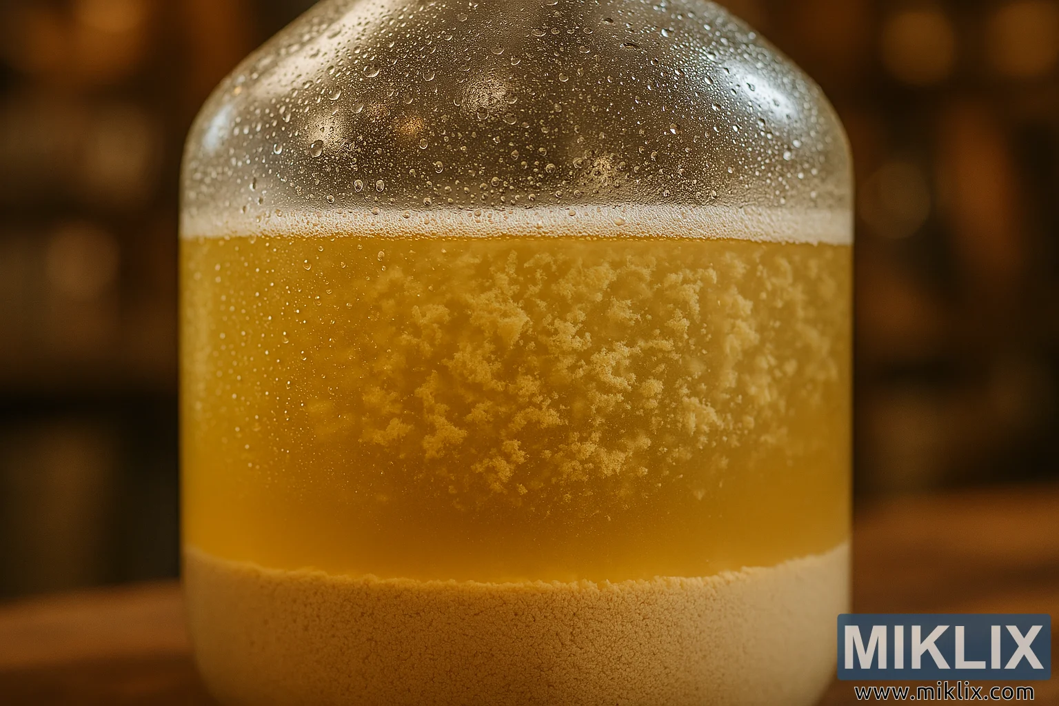 Detailed image of a glass fermentation vessel highlighting yeast flocculation, sedimentation, and condensation in a warm brewery setting.