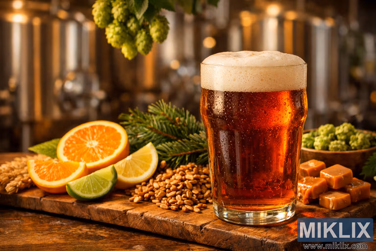 High-resolution landscape image of an amber beer inspired by California Ale yeast, styled with citrus, pine, caramel malts, and brewery equipment in warm natural light.