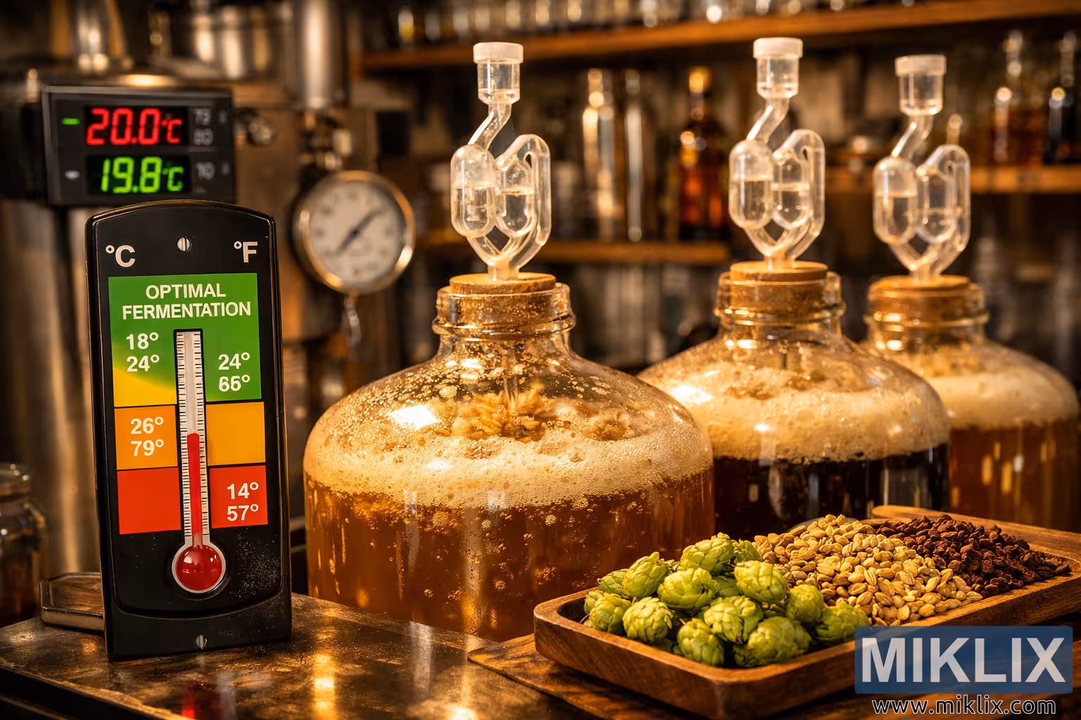 A warm, detailed image of a home brewery fermentation chamber featuring bubbling glass carboys, temperature gauges, hops, malts, and brewing equipment, highlighting precise fermentation management.