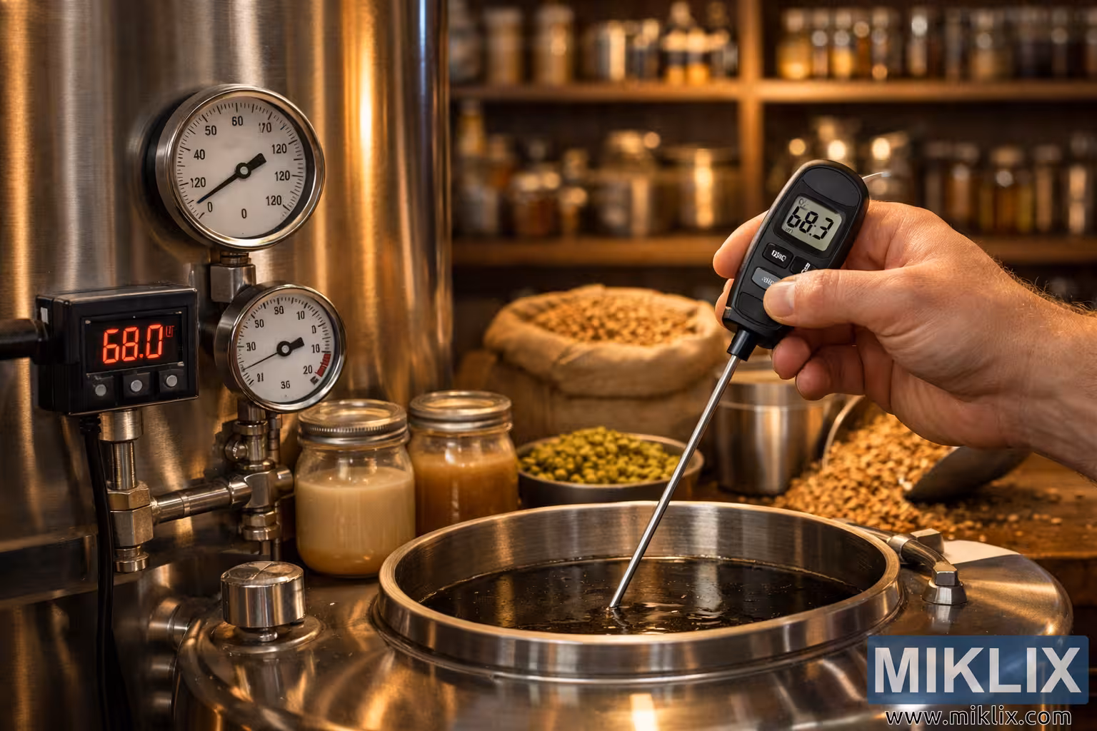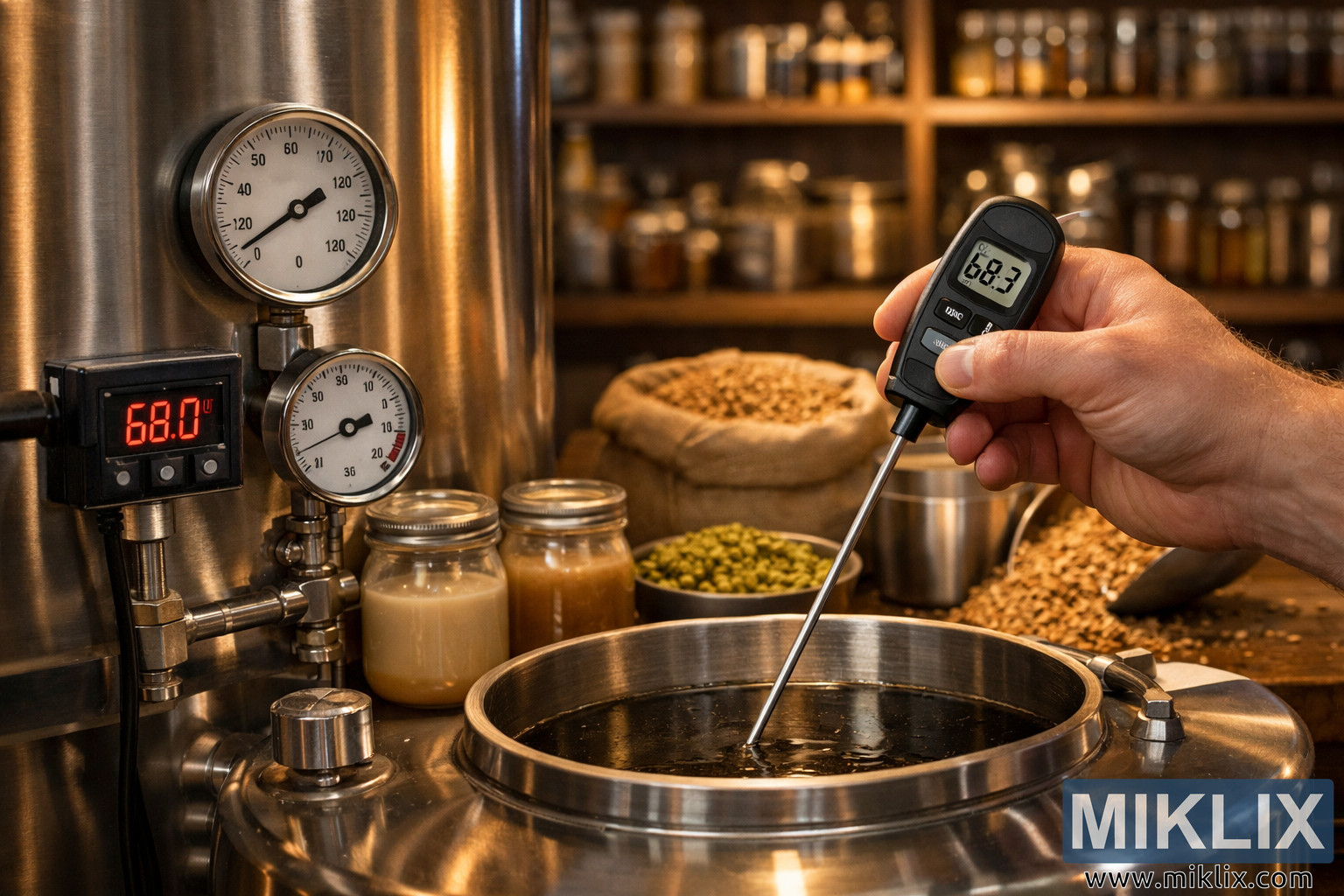 A professional brewing scene featuring a stainless-steel fermentation tank, temperature gauges, malt, hops, and a hand measuring temperature, highlighting precision and best practices in fermentation.