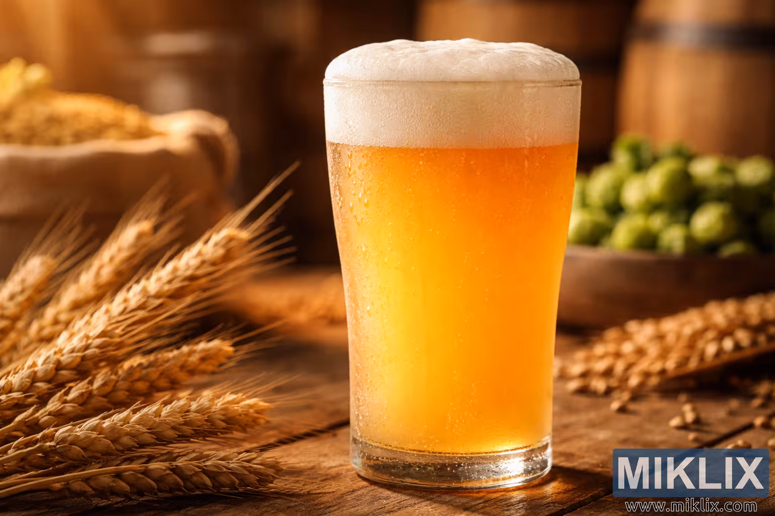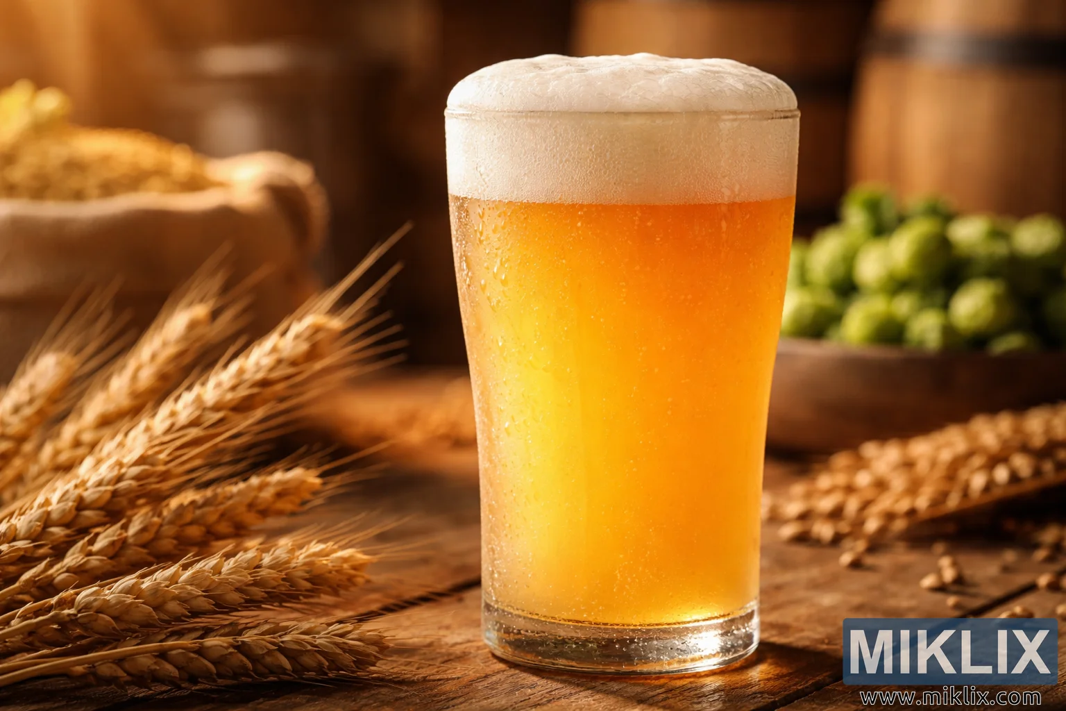 A warm, sunlit close-up of a hazy wheat beer with a frothy white head, glowing golden-orange tones, rising bubbles, and a rustic brewery backdrop with wheat, malt, and hops.