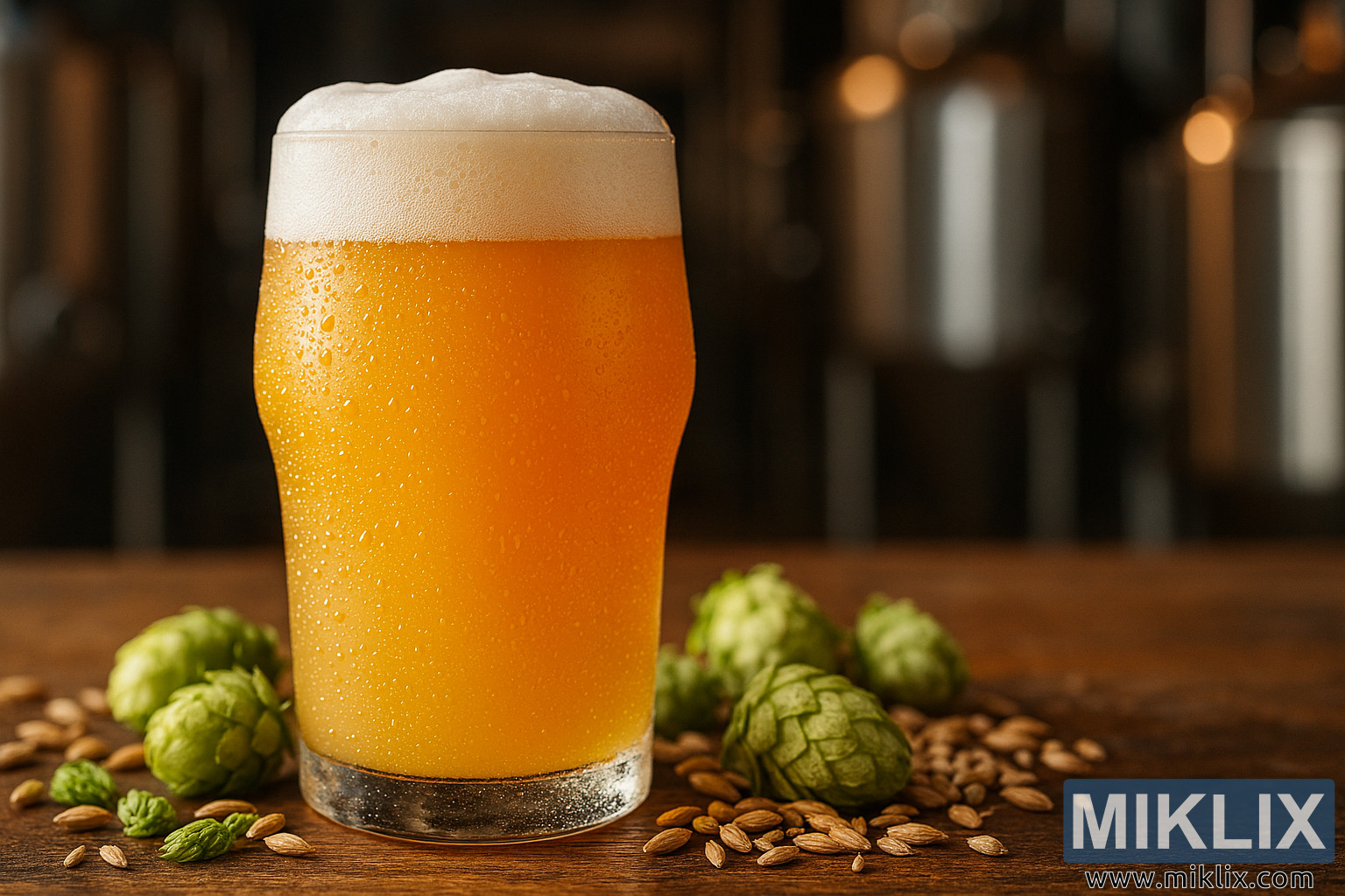 A vibrant hazy IPA with golden-orange hue and frothy head sits on a rustic table surrounded by hops and grains, with brewing equipment softly blurred in the background.