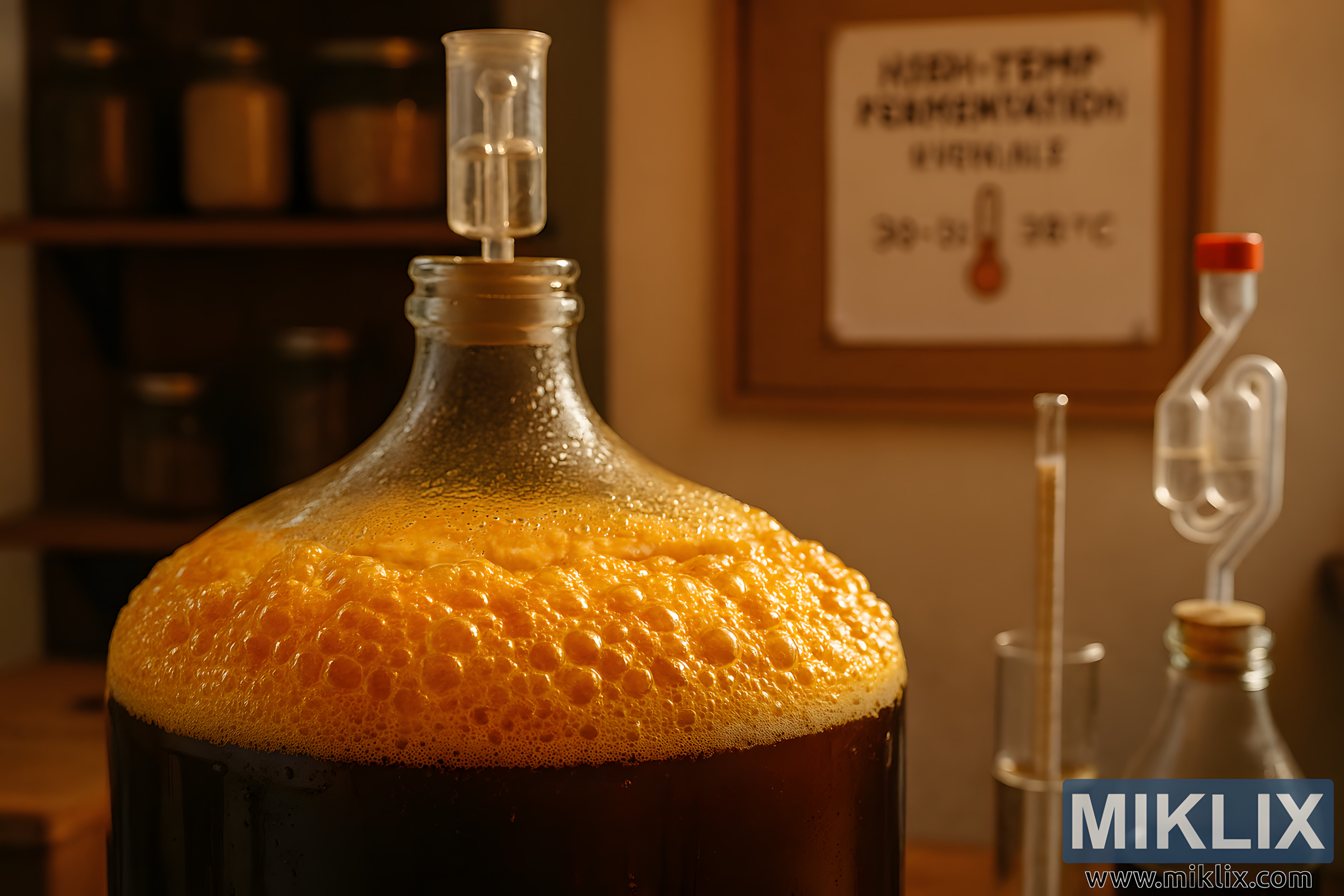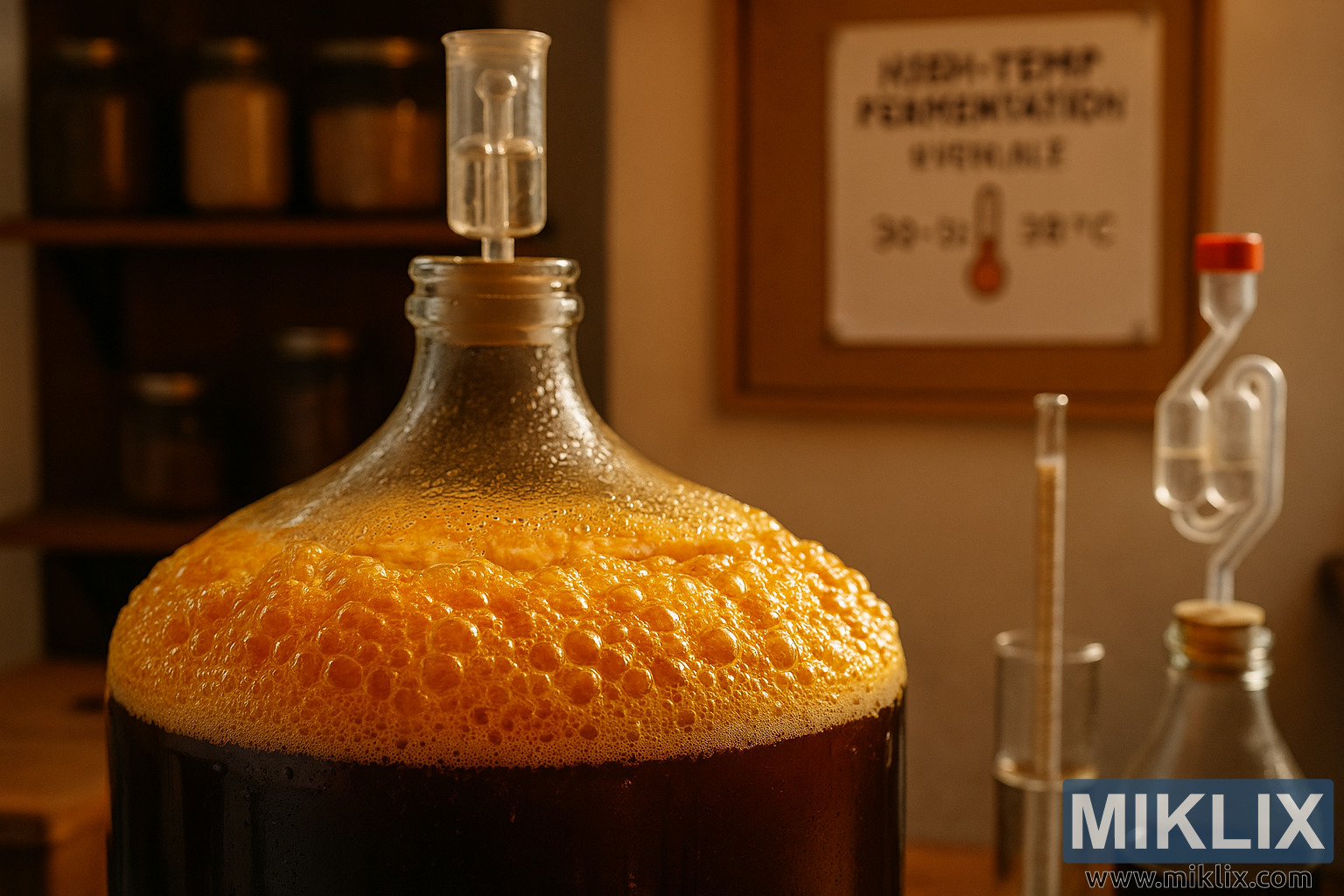 In the middle ground, the brewing setup is framed by essential tools and accessories. A wooden countertop supports the vessels, and scattered brewing implements hint at a hands-on, methodical process. The lighting is warm and directional, casting a golden glow that enhances the amber tones of the wort and the orange hues of the krausen.