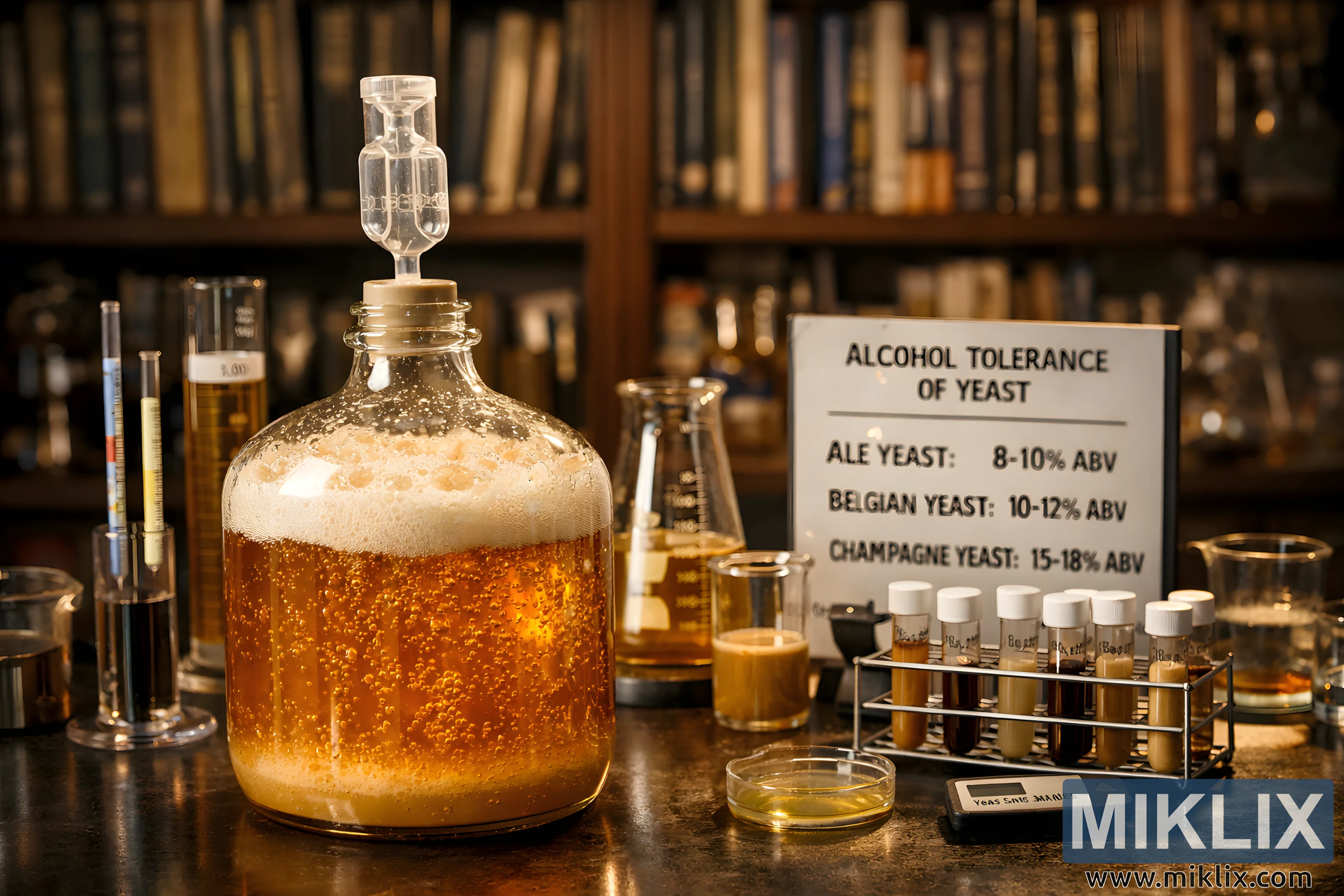 The image presents a meticulously staged laboratory environment dedicated to the fermentation of high-ABV beers, blending scientific precision with the warm, craft-focused atmosphere of advanced brewing. Dominating the foreground is a large, clear glass carboy resting on a sturdy lab bench. It is filled with a luminous, golden liquid that immediately communicates vitality and motion: countless streams of fine bubbles rise steadily from the bottom, collecting beneath a creamy foam cap before releasing carbon dioxide through a transparent airlock fitted snugly at the top. The airlock, partially filled with liquid, visually confirms active fermentation and serves as a focal symbol of controlled biochemical activity. Soft, directional lighting highlights the curvature of the glass and the effervescence within, drawing attention to the yeast-driven transformation taking place inside the vessel. Surrounding the carboy in the middle ground is an orderly arrangement of brewing instruments that reinforce the technical nature of the scene. Hydrometers stand upright in graduated cylinders, their measurement scales clearly visible and aligned for precise readings. Small flasks and beakers hold samples of wort and beer in varying shades of amber and gold, suggesting different stages of fermentation or comparative testing. A compact rack of labeled yeast samples sits nearby, each vial filled with creamy or tan suspensions that hint at different strains selected for alcohol tolerance and flavor contribution. Prominently displayed is a simple reference board or placard detailing yeast alcohol tolerance ranges, linking the visual tools directly to the concept of managing fermentation strength and achieving elevated ABV levels. In the background, shelves stretch across the frame, lined with numerous books devoted to brewing science, microbiology, and fermentation theory. Their spines form a textured backdrop, slightly out of focus, reinforcing depth while keeping attention on the active process in the foreground. The lighting here is dimmer and warmer, creating an inviting, almost academic ambiance that contrasts with the clarity and brightness of the glassware. Overall, the composition balances artistry and instruction: it feels professional and credible, yet accessible, illustrating the complexity of alcohol management in brewing while celebrating the living role of yeast as the engine of fermentation.