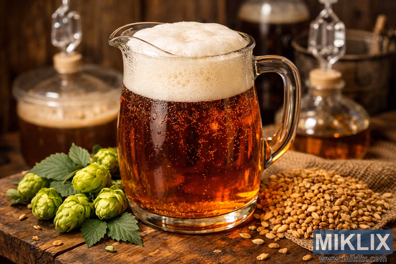 Close-up image of a glass pitcher filled with amber Belgian strong ale, featuring lively carbonation, a creamy white head, fresh hops, malt grains, and rustic brewing equipment in a warm, cozy brewery atmosphere.