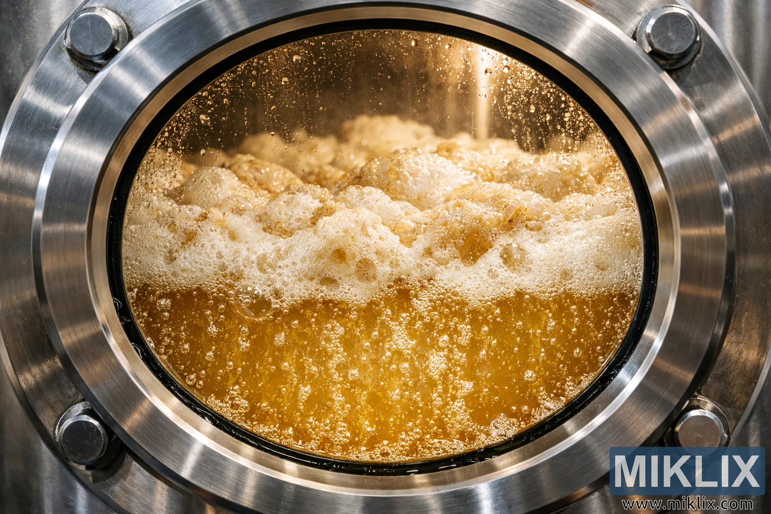 Overall, the photograph blends artistry and industry, presenting brewing not merely as production but as a living process. The close perspective, combined with the clarity and detail of the bubbles, foam, and condensation, immerses the viewer in the dynamic interior of the fermentation tank. It is both a technical and sensory portrayal of beer in its most active state, frozen in time yet clearly full of movement and energy.