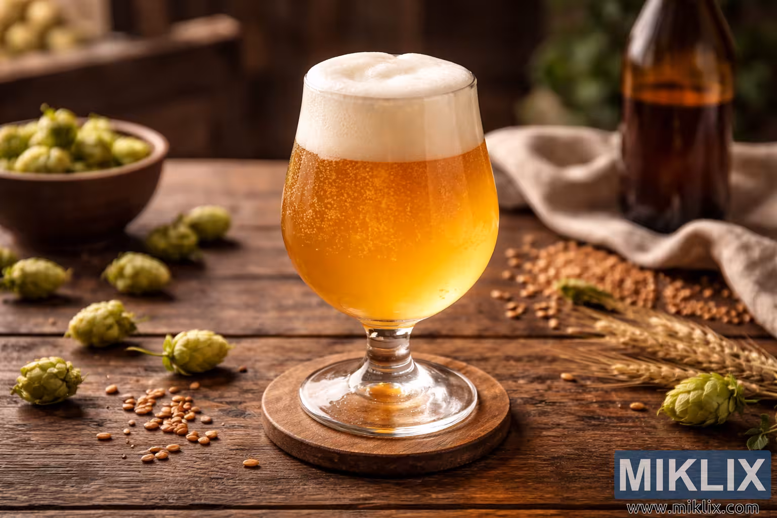 High-resolution landscape photo of a golden Belgian Saison in a tulip glass on a rustic wooden table with hops, barley, and warm natural lighting.