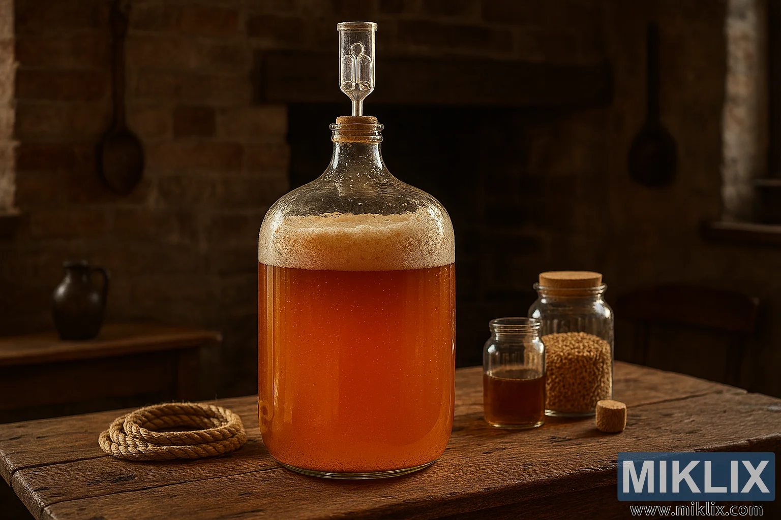 The photograph’s composition and technical choices emphasize craft and atmosphere: a full-frame DSLR aesthetic with a 35mm-equivalent perspective places the viewer at table height, close enough to feel the texture of the wood and the warmth of the light. A shallow depth of field keeps the carboy and immediate tabletop elements crisply in focus while the background melts into a painterly bokeh. Color grading favors natural, warm hues—golden ambers, rich browns, and muted earth tones—balanced with realistic contrast and minimal grain for a cinematic, timeless look. No people, logos, or brand names appear; the scene is intentionally human-centered through objects and light rather than through faces. The overall mood is cozy, nostalgic, and quietly celebratory of traditional brewing craft, inviting the viewer to linger on the small, living details of fermentation and the tactile world that surrounds it.