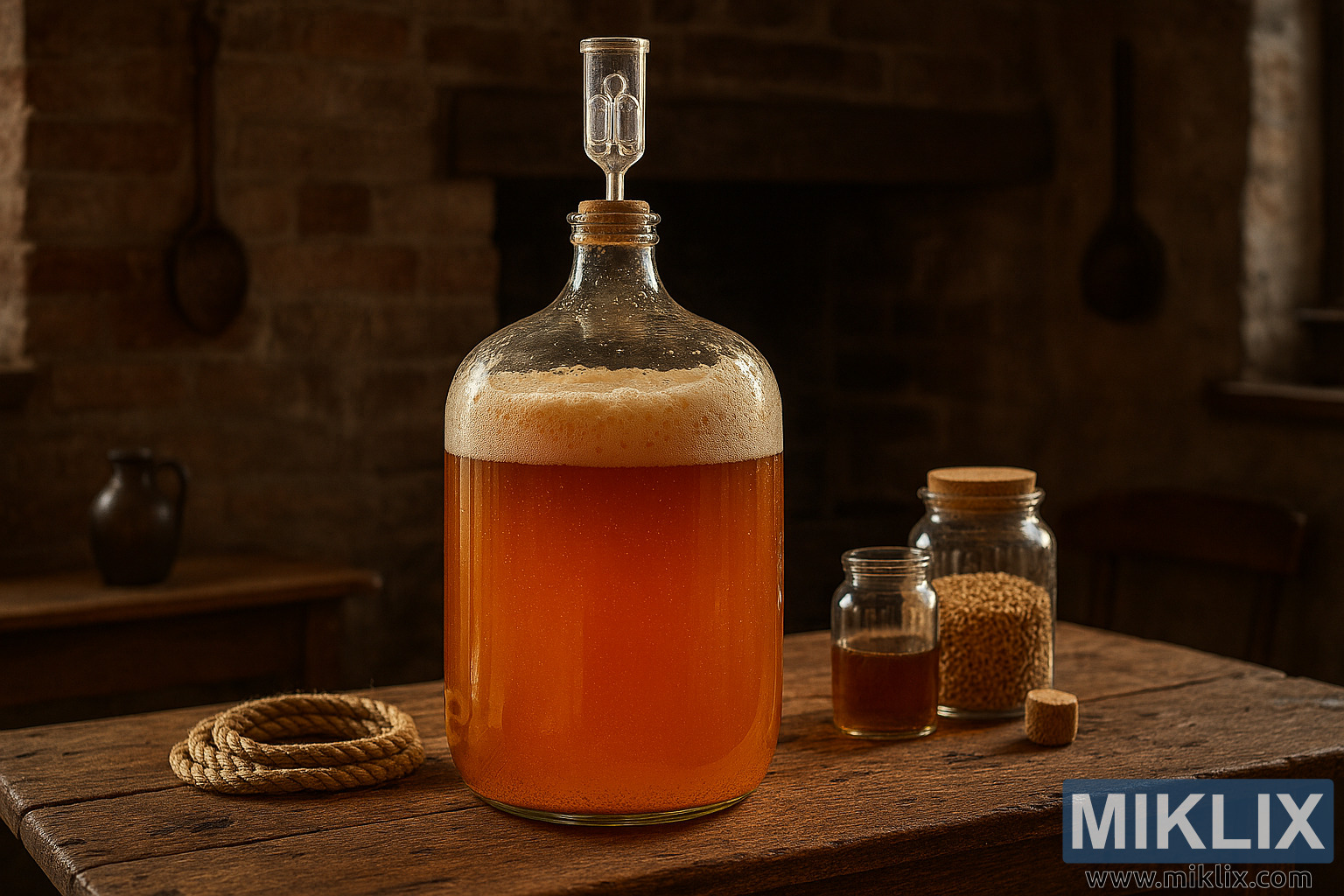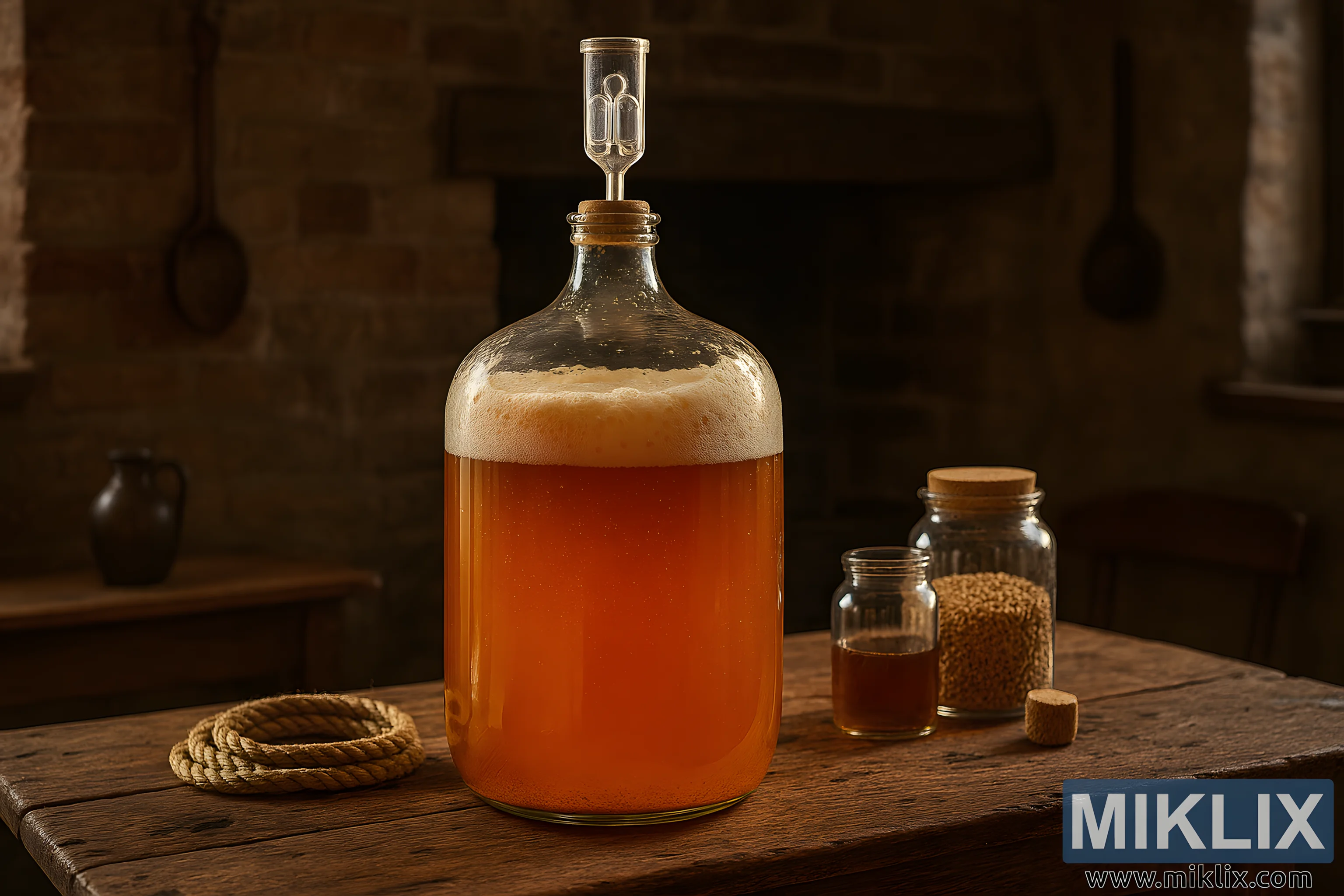 The table beneath the carboy is scarred and textured, its grain and knots rendered in high detail: scratches, dents, and a patina of years of use speak to hands-on craft. To the left of the carboy a coil of coarse beige rope rests casually; to the right, a pair of glass jars with cork lids sit close together—one filled with pale malted barley, its kernels visible through the glass, the other empty with a loose cork beside it. A wooden spoon with a darkened patina leans against the brick wall in the background, and a small, dark ceramic jug adds to the scene’s authenticity.