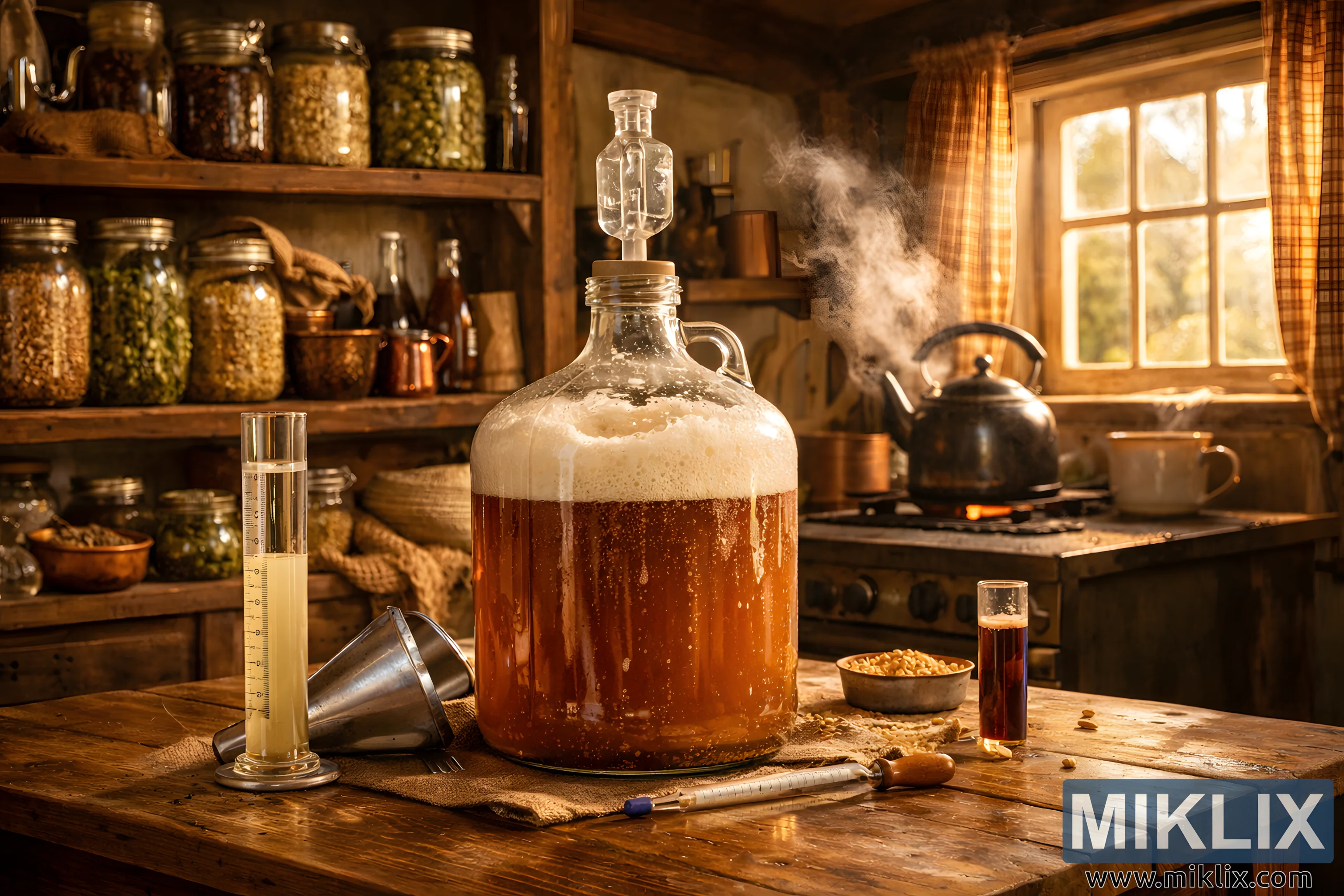A cozy farmhouse kitchen scene showcasing home brewing, with a bubbling beer fermentation vessel, rustic tools, ingredient jars, and warm sunlight creating a welcoming, traditional atmosphere.