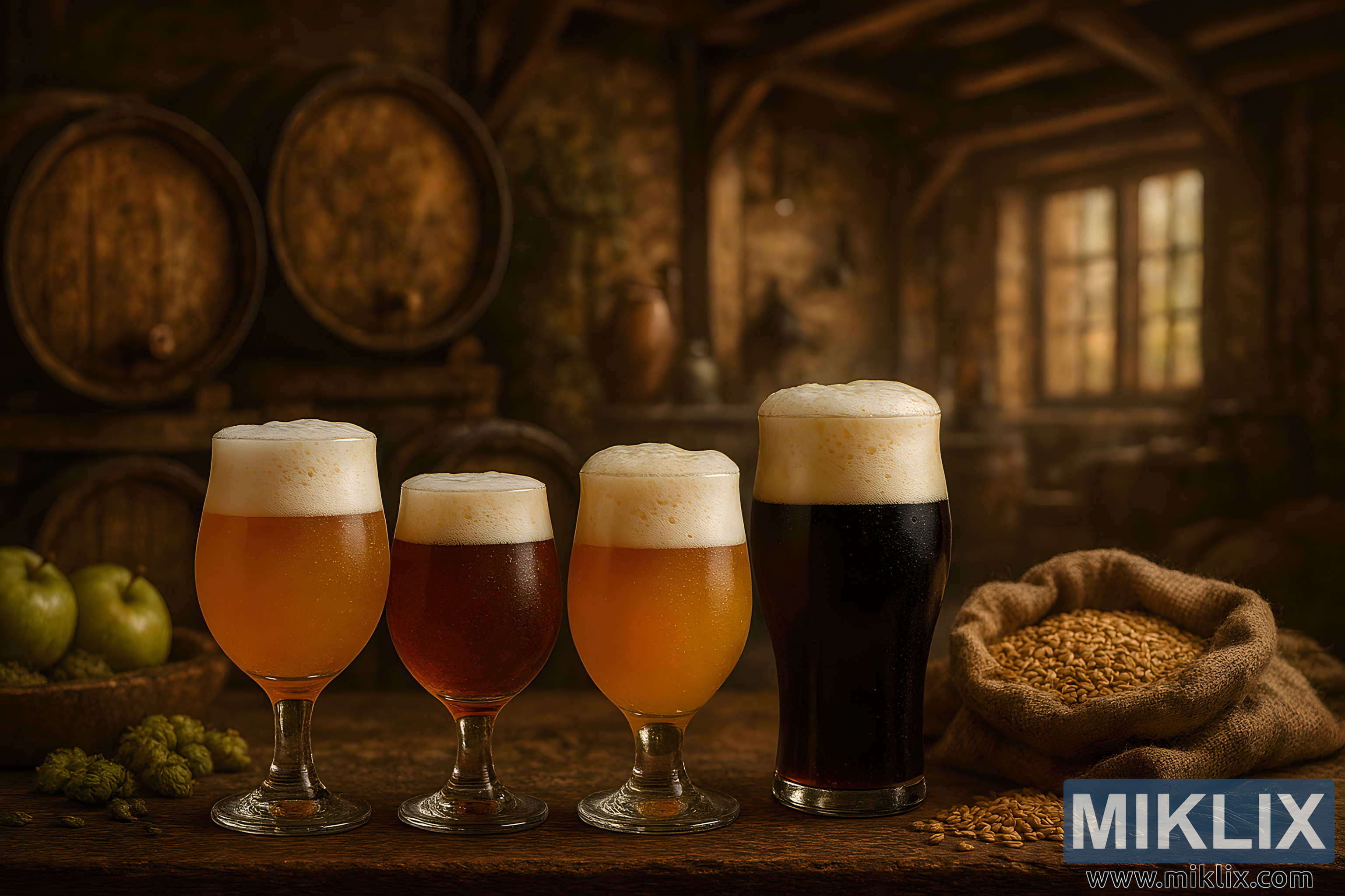 The background reveals the interior of the brewery, constructed with exposed wooden beams and aged brick walls. Dim ambient lighting and soft shadows create a nostalgic and inviting atmosphere. Large windows with wooden mullions allow sunlight to stream in, casting golden hues across the scene. The interplay of light and shadow adds depth and warmth, while the rustic textures of wood, brick, and burlap contribute to the handcrafted aesthetic.