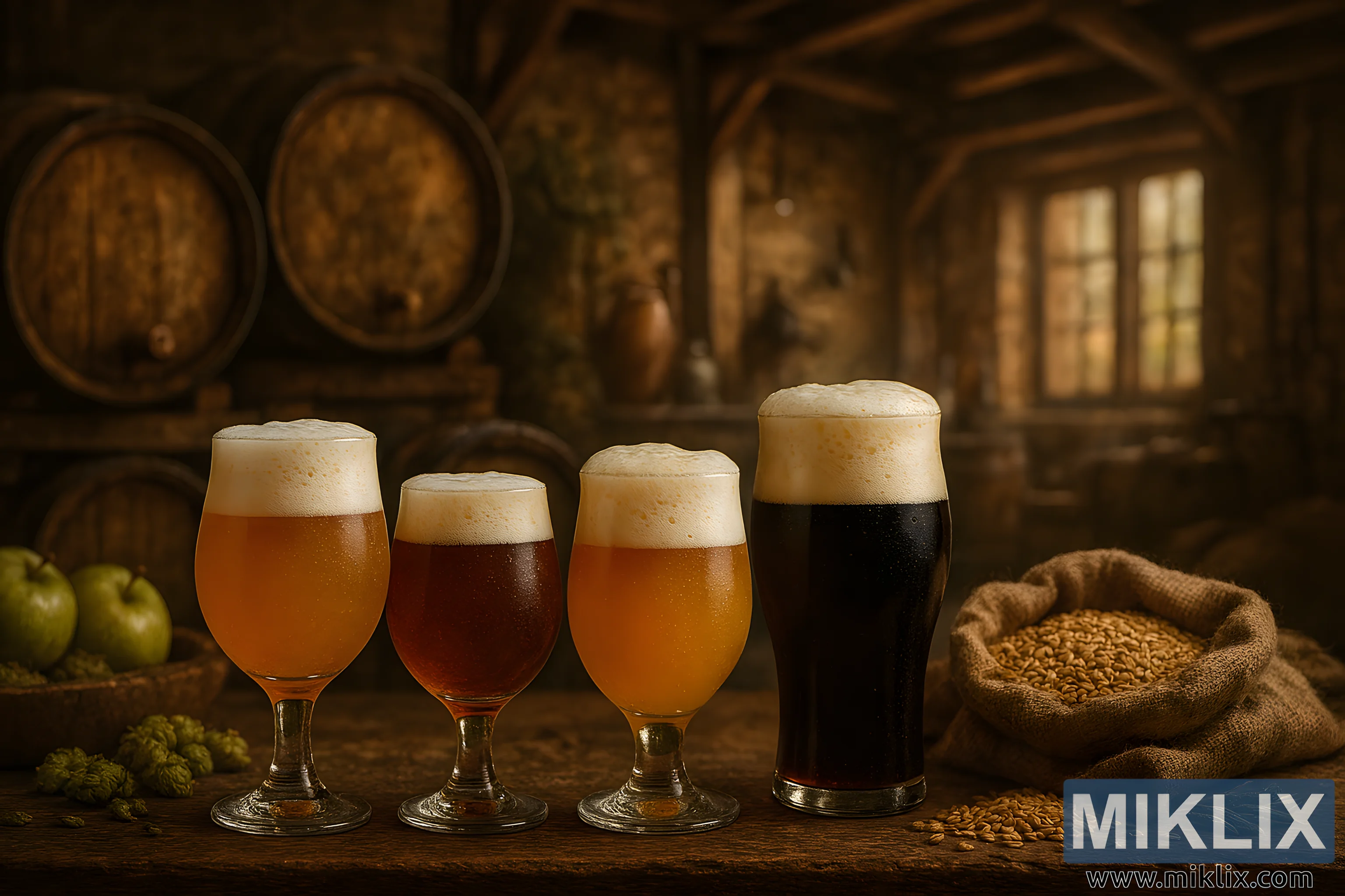 The middle ground features three large oak barrels stacked against a rustic brick wall. These barrels, aged and textured, evoke the traditional methods of fermentation and aging. Surrounding them are visual cues of Brettanomyces character: three green apples with mottled skin hint at sour and fruity notes, while scattered hops and a burlap sack spilling golden malted barley suggest earthy funk and subtle spice. The hops are irregularly shaped and slightly compressed, while the barley grains glisten in the warm light, reinforcing the artisanal mood.