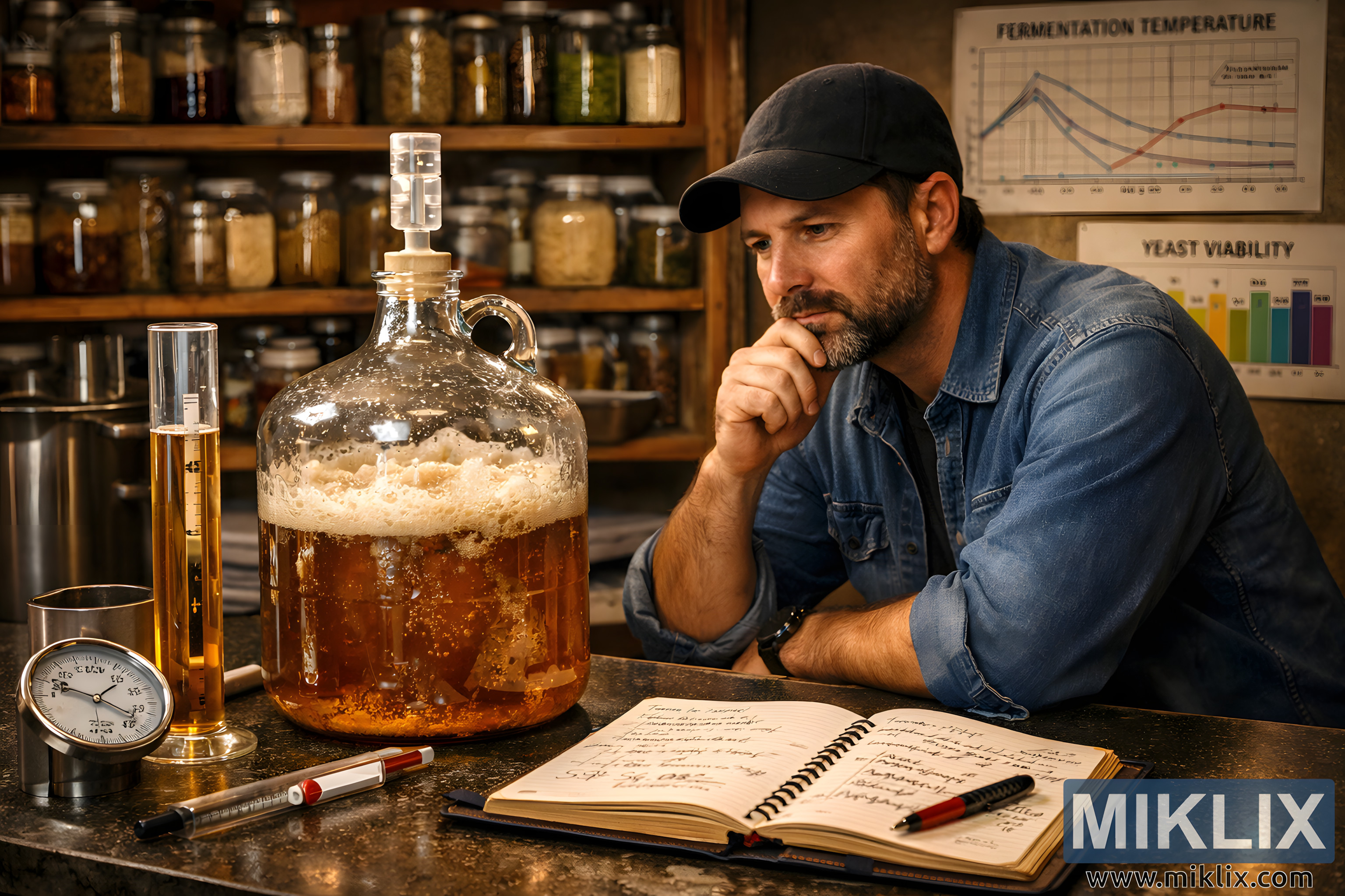 A detailed scene of a brewer troubleshooting yeast fermentation, featuring a bubbling carboy, hydrometer, notebook, and ingredient-filled shelves in a cozy, science-driven workspace.