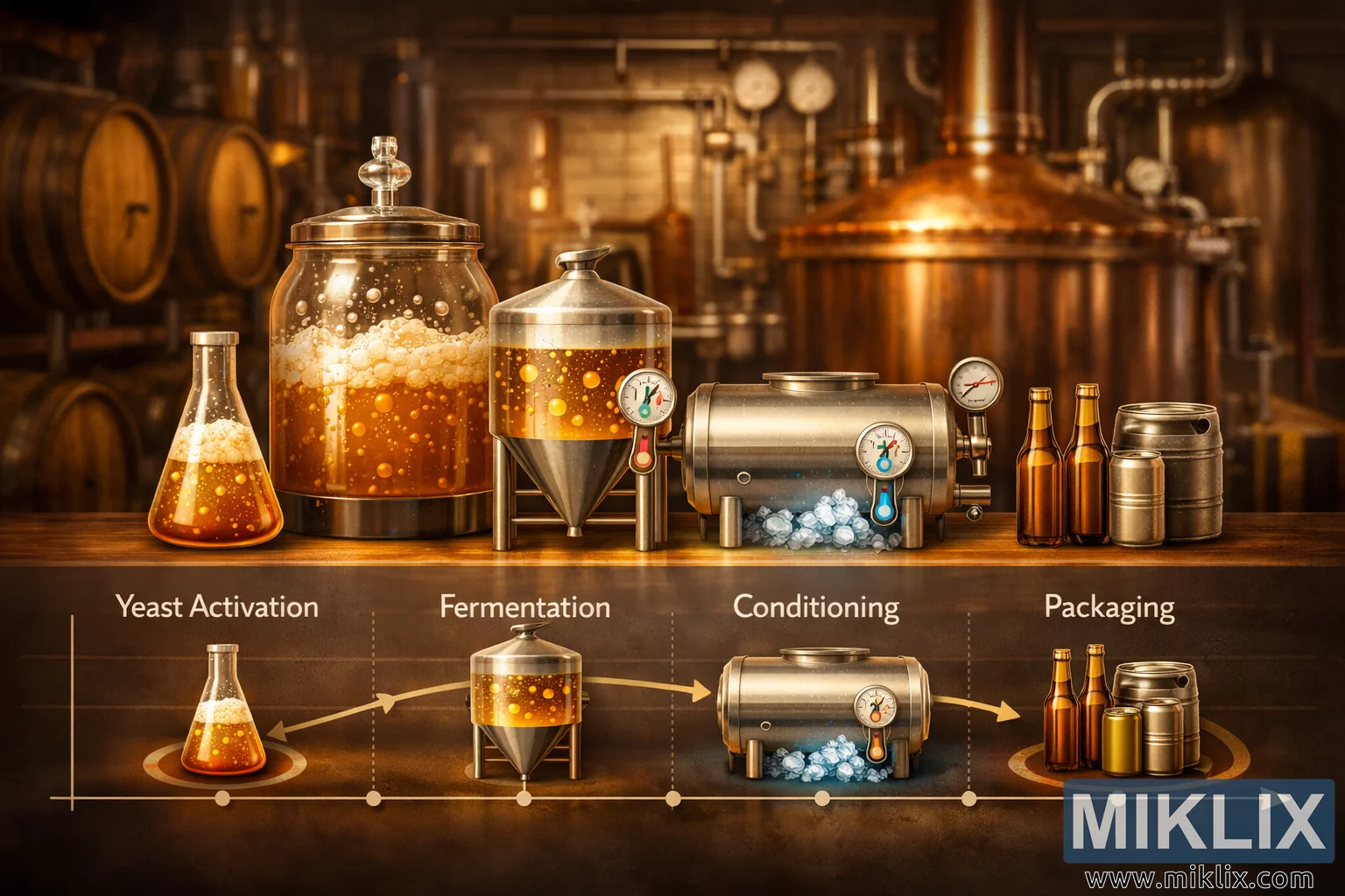 This landscape-oriented illustration presents a detailed and visually engaging overview of the lager beer fermentation process, arranged as a structured timeline in the foreground. The composition is carefully layered to guide the viewer’s eye from left to right, emphasizing the sequential nature of yeast-driven transformation. At the front, a clean and clearly organized timeline chart stretches horizontally across a wooden surface, marked by evenly spaced nodes that represent the key stages of fermentation: yeast activation, active fermentation, conditioning, and packaging. Each stage is visually distinguished by a representative icon rather than text, reinforcing a universal, language-neutral design. The yeast activation phase is symbolized by a glass vessel filled with golden liquid and rising bubbles, suggesting metabolic awakening and the beginning of sugar conversion. The fermentation stage is depicted with a larger stainless steel tank, visibly effervescent, conveying vigorous yeast activity and carbon dioxide release. Conditioning is illustrated by a horizontal tank resting on a bed of cooling elements, paired with a temperature gauge to highlight the controlled, low-temperature maturation typical of lager production. Finally, the packaging phase is represented by neatly arranged bottles and a small keg, indicating the completion of the brewing cycle.