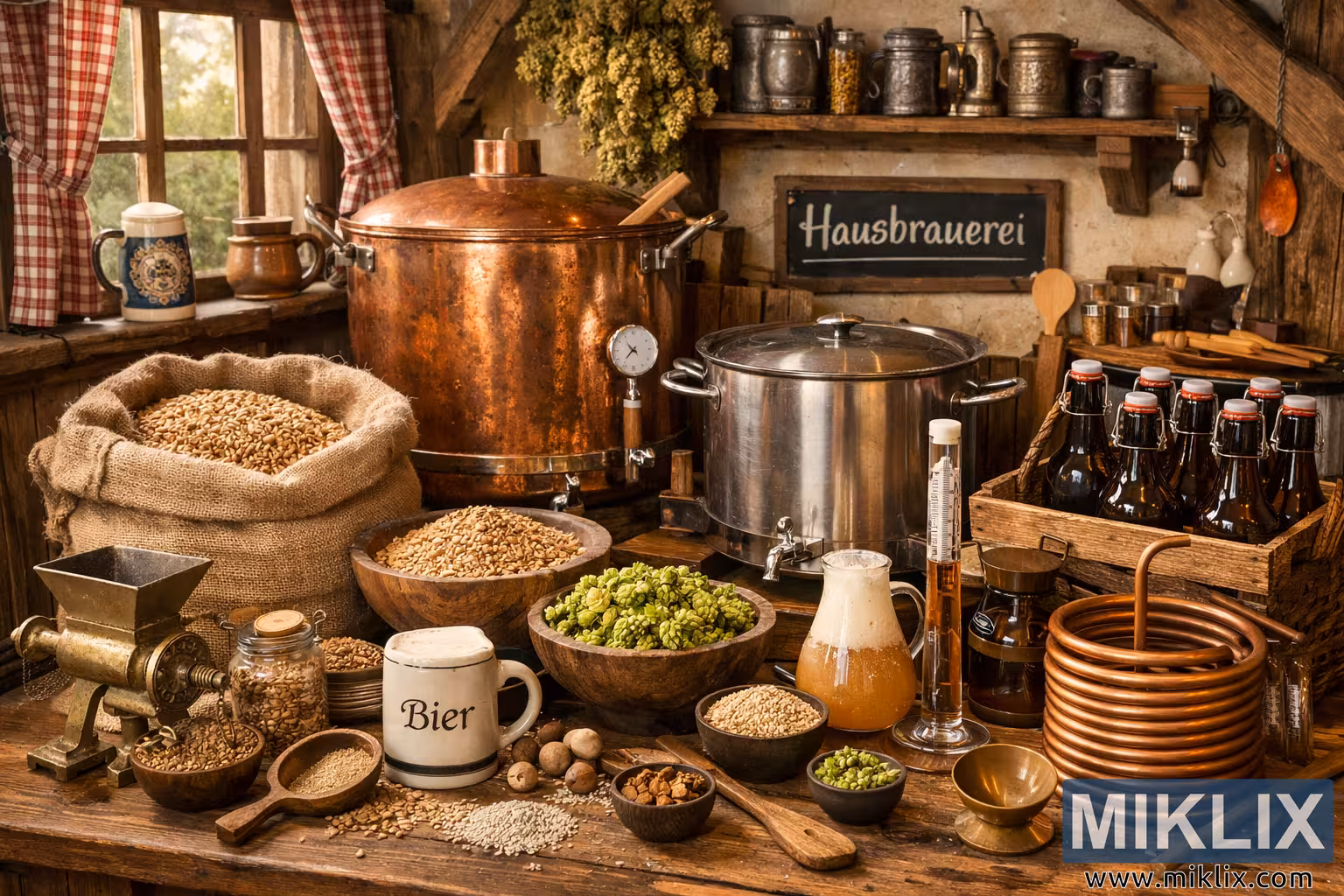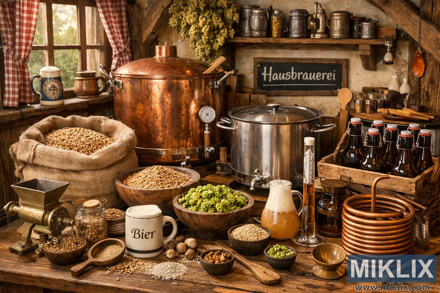 High-resolution landscape photo of a traditional German homebrewing setup featuring copper kettles, malt, hops, brewing tools, and rustic decor in a cozy Hausbrauerei setting.