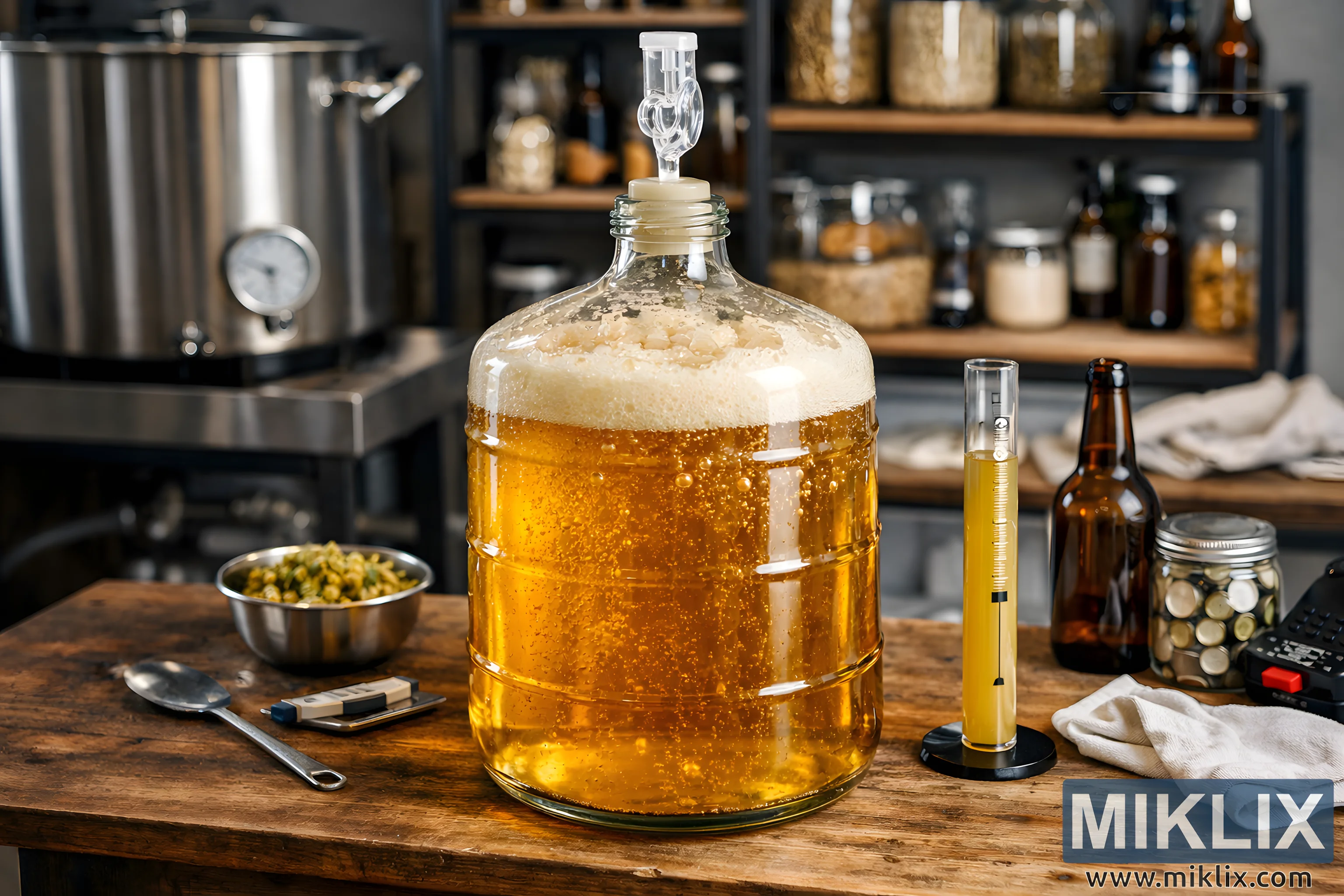 Detailed view of a glass carboy fermenting lager beer on a wooden table, surrounded by hops, a hydrometer, bottles, and stainless brewing equipment in a modern homebrewing workspace.