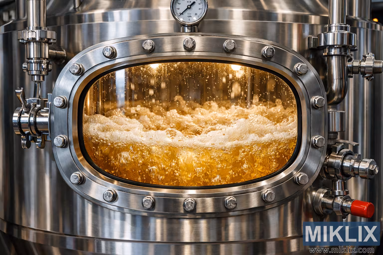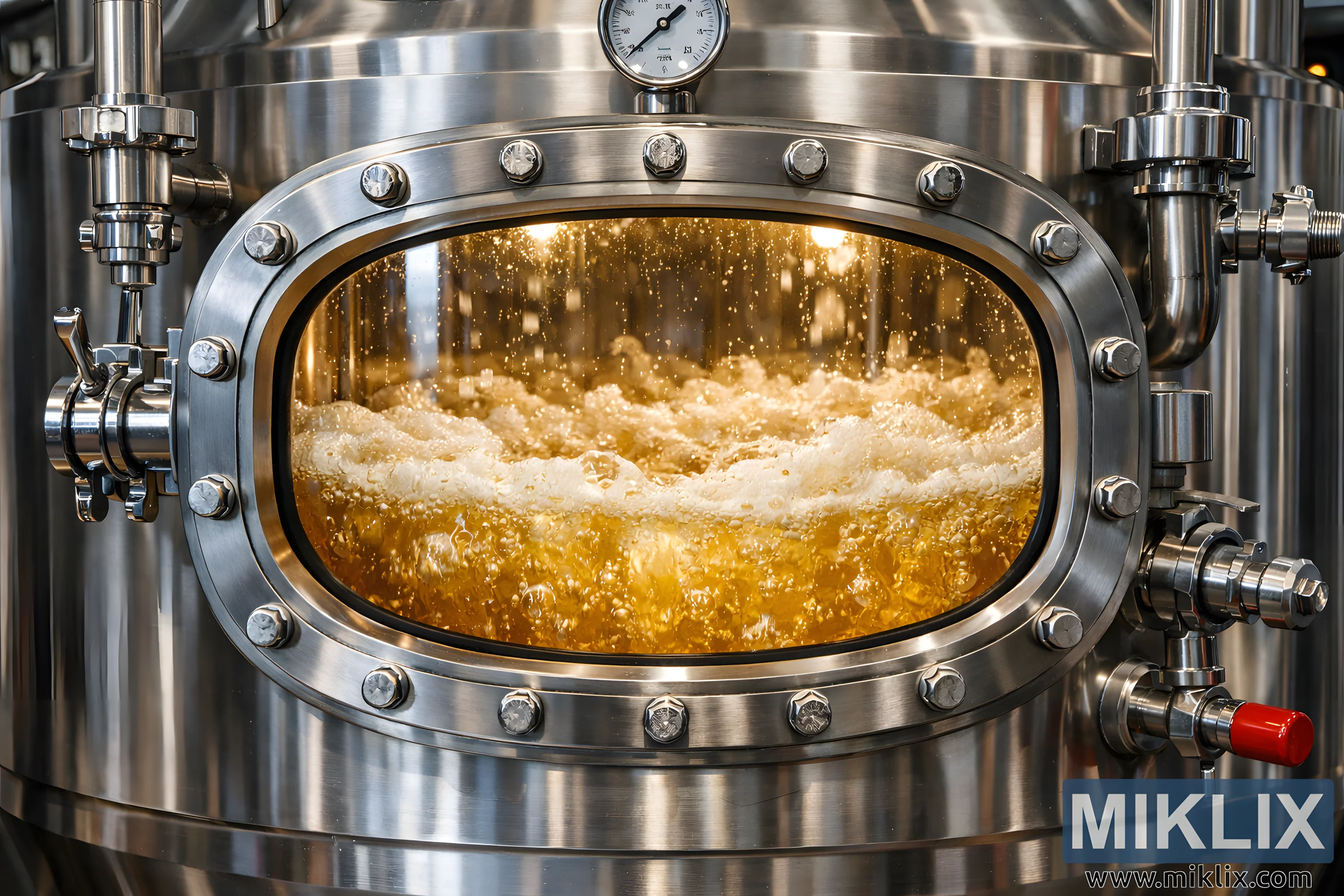 High-resolution photo of a stainless steel brewery fermenter featuring a glass window that reveals actively fermenting lager with bubbles and foam inside.