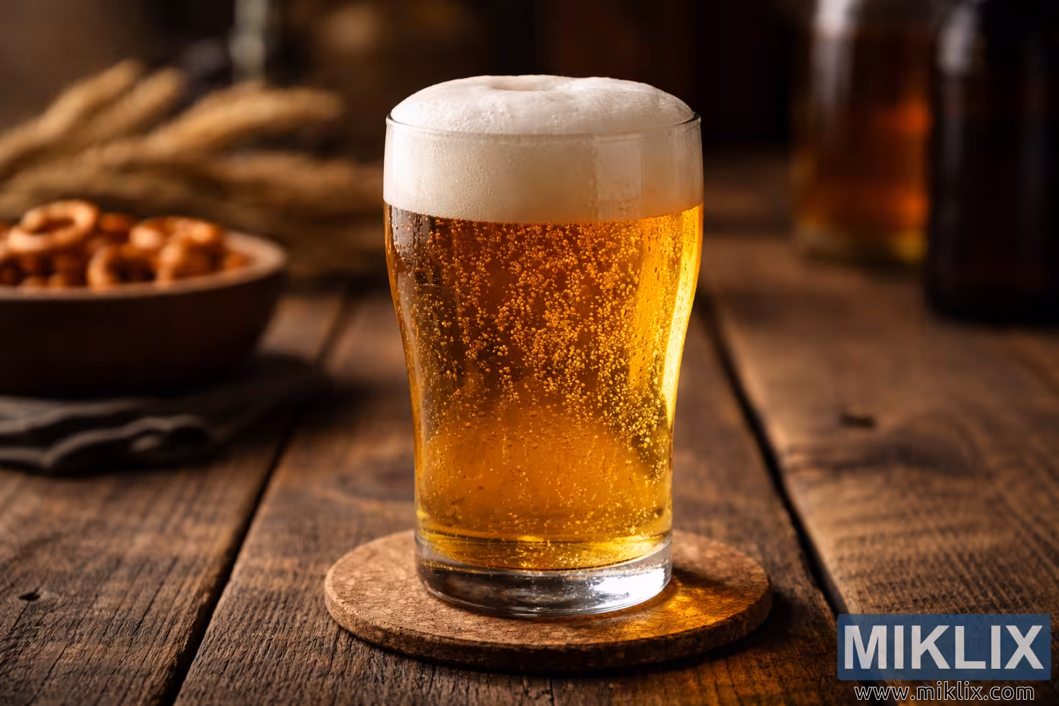 In the softly blurred background, hints of complementary elements add context without distracting from the main subject. A small bowl of pretzels sits off to one side, their twisted shapes and toasted brown color subtly echoing the warm palette of the scene. Behind them, indistinct shapes suggest additional bottles or glasses, reinforcing the setting as a relaxed drinking environment such as a pub, brewery, or home gathering. The shallow depth of field ensures that these background details remain out of focus, guiding the viewer’s attention back to the lager itself. Overall, the image conveys craftsmanship, comfort, and enjoyment, celebrating the simple pleasure of a well-poured beer in an inviting, rustic setting.