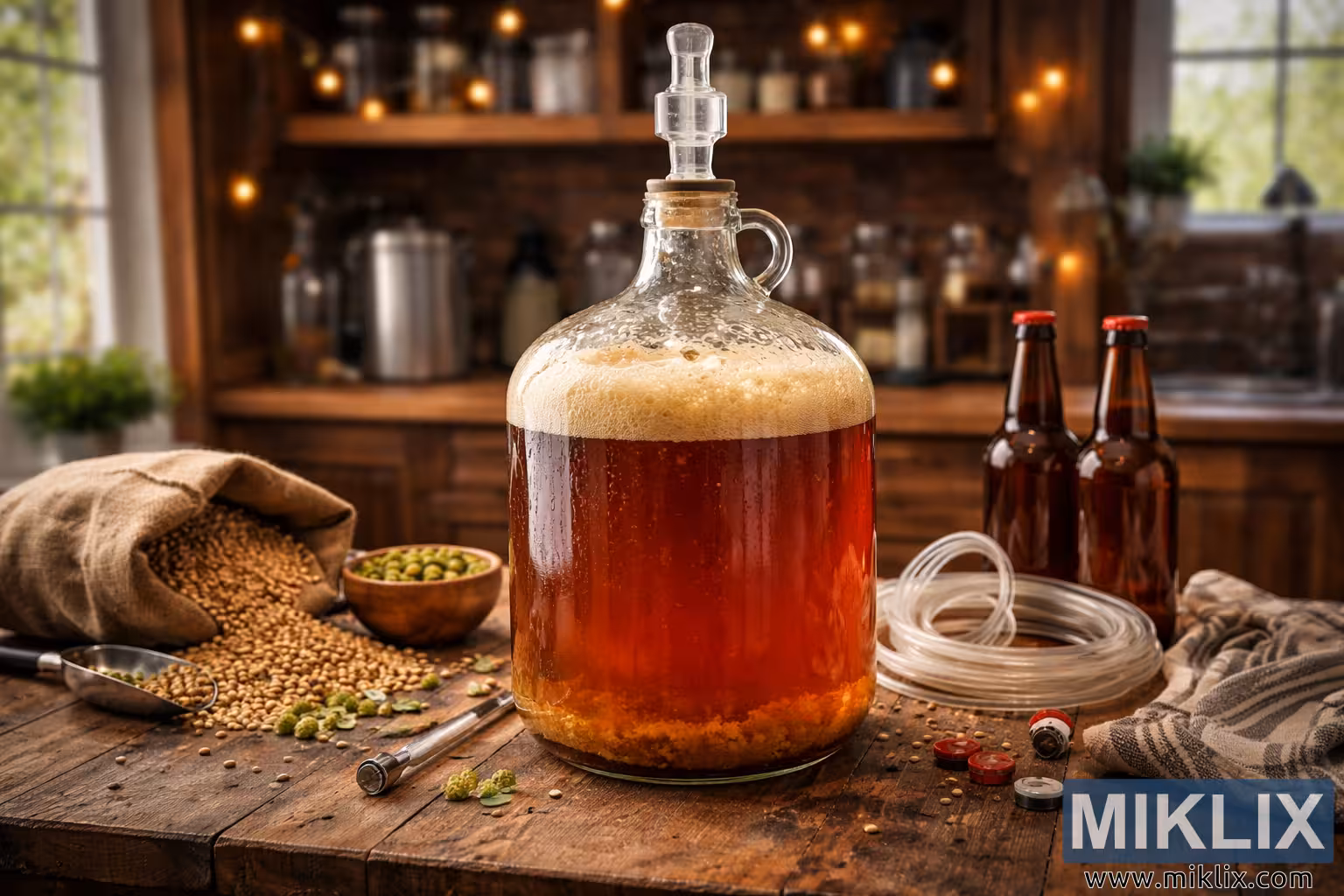 High-resolution photo of American ale fermenting in a glass carboy on a rustic wooden table, with malt, hops, bottles, and tools in a cozy traditional homebrewing setting.