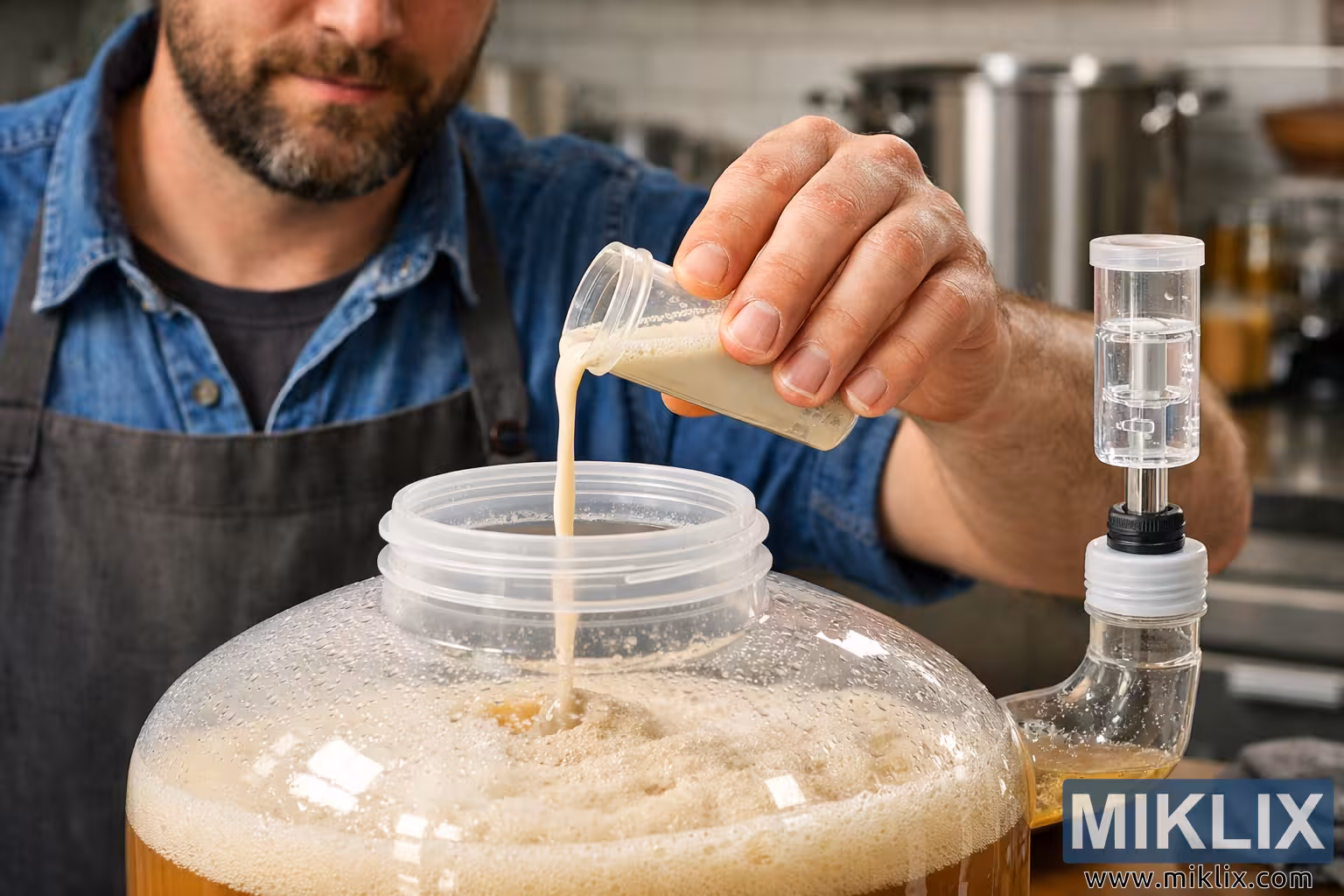A detailed close-up photograph of a homebrewer carefully pitching liquid yeast into a fermentation vessel, captured in a modern kitchen with brewing equipment in the background.