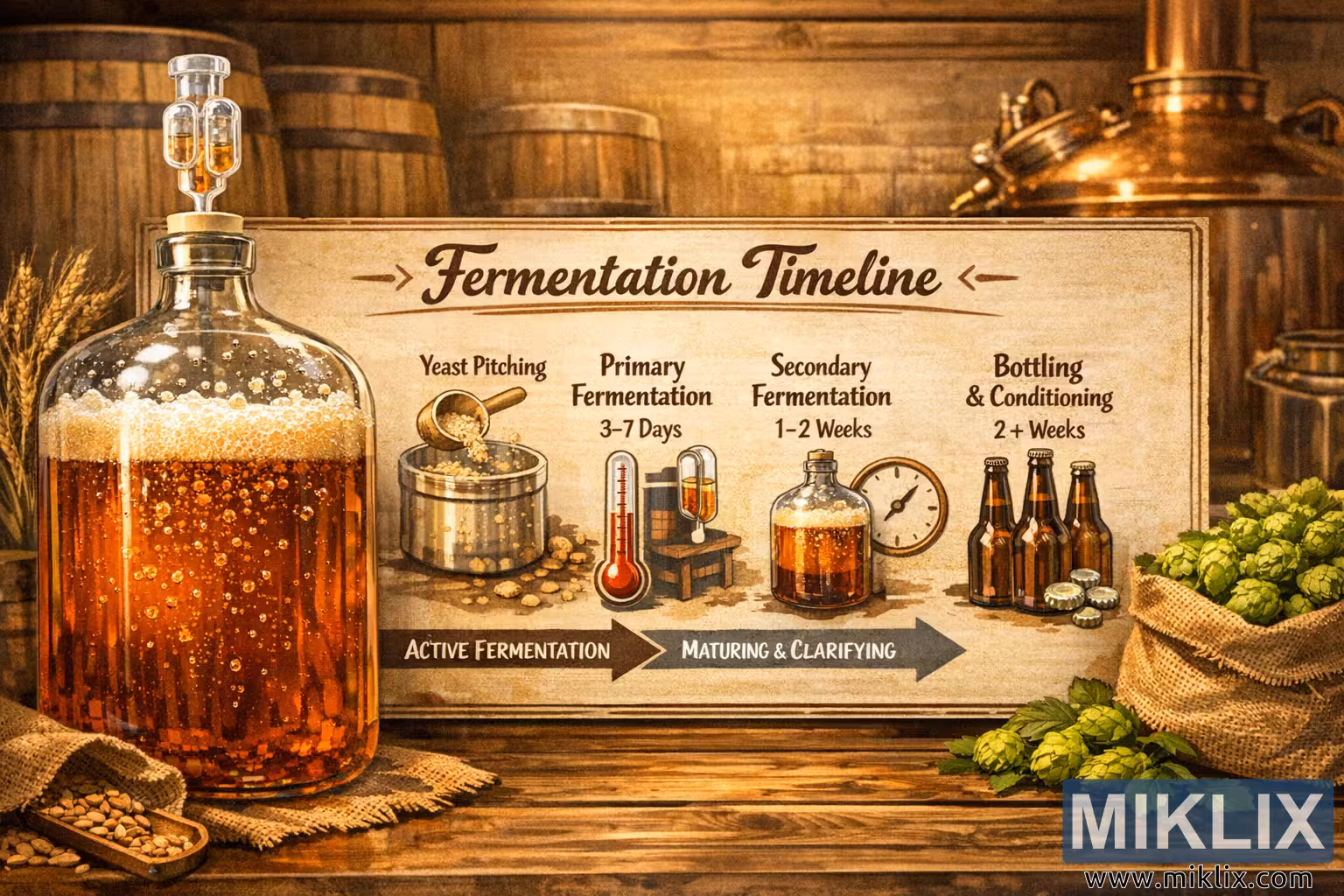 Behind the vessel, occupying the central portion of the image, is a horizontal timeline chart mounted on a rustic wooden surface. The chart is labeled as a fermentation timeline and is divided into clearly marked stages. These stages include yeast pitching, primary fermentation, secondary fermentation, and bottling and conditioning. Each stage is represented with simple, intuitive icons such as a scoop of yeast, a thermometer, a clock, glass bottles, and caps. Short time ranges accompany the stages, visually communicating how fermentation progresses over days and weeks. Arrows along the bottom of the chart guide the viewer through the process, reinforcing the step-by-step nature of beer fermentation.