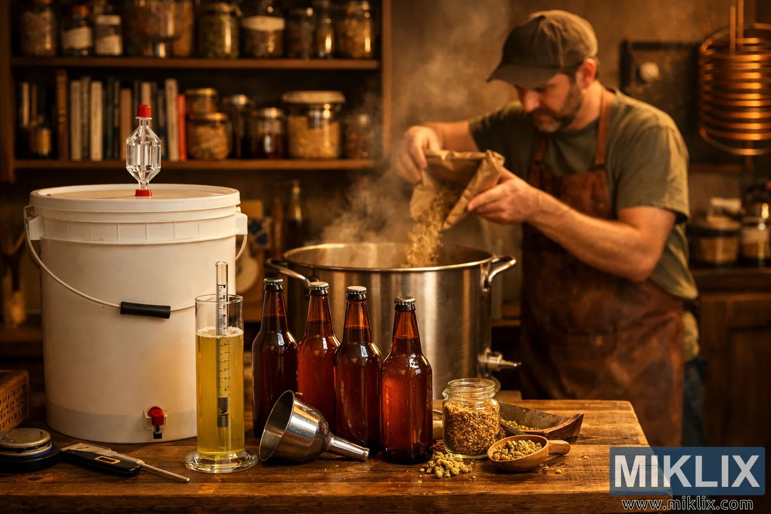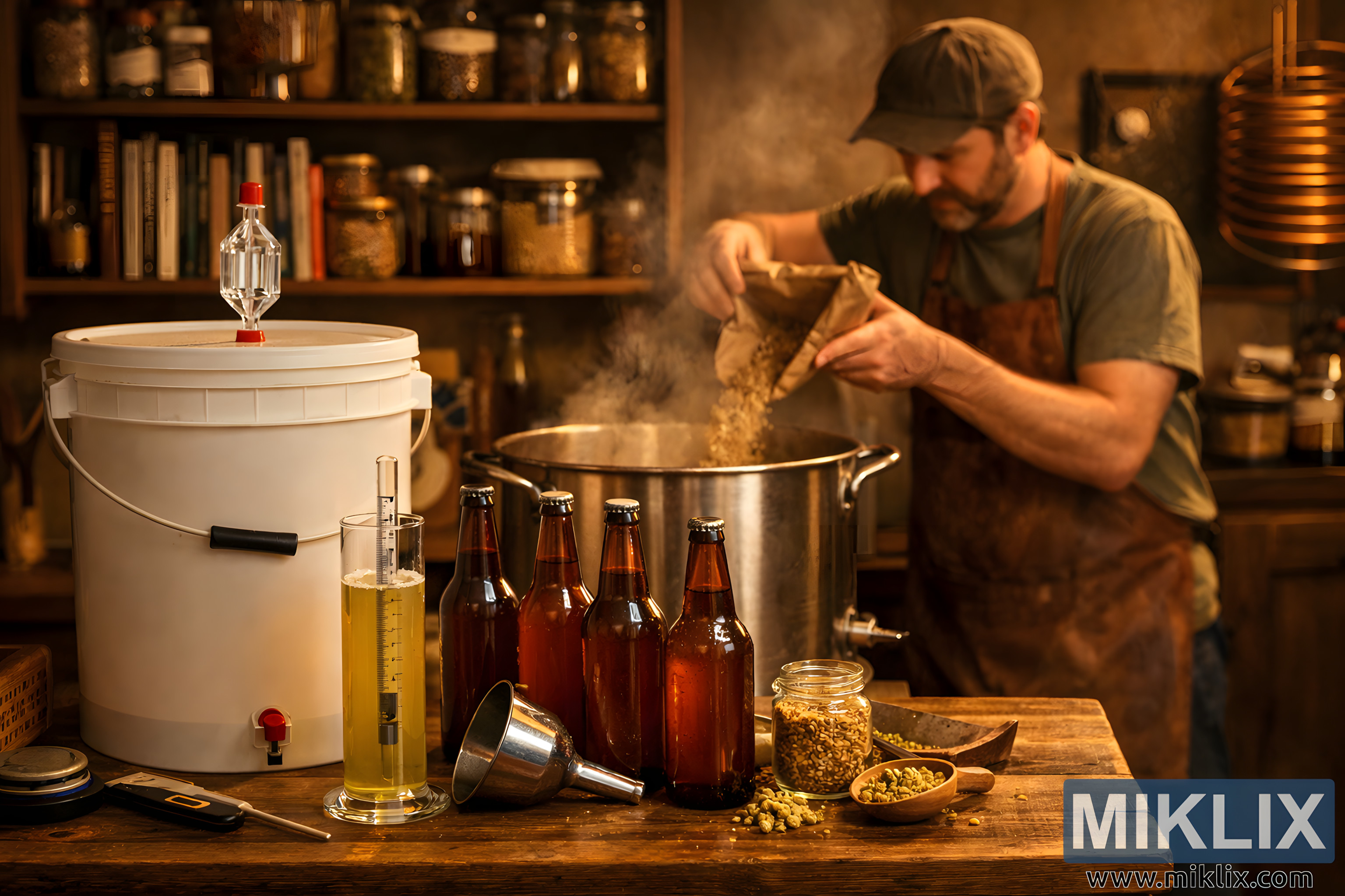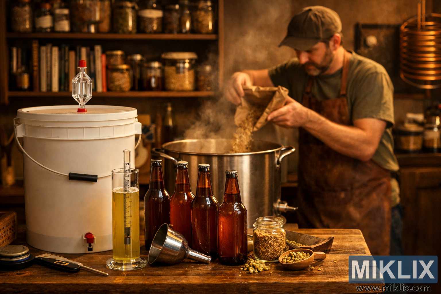 A cozy homebrewing scene showing a passionate brewer at work, surrounded by fermentation tools, bottled beer, and brewing books in warm, golden light.