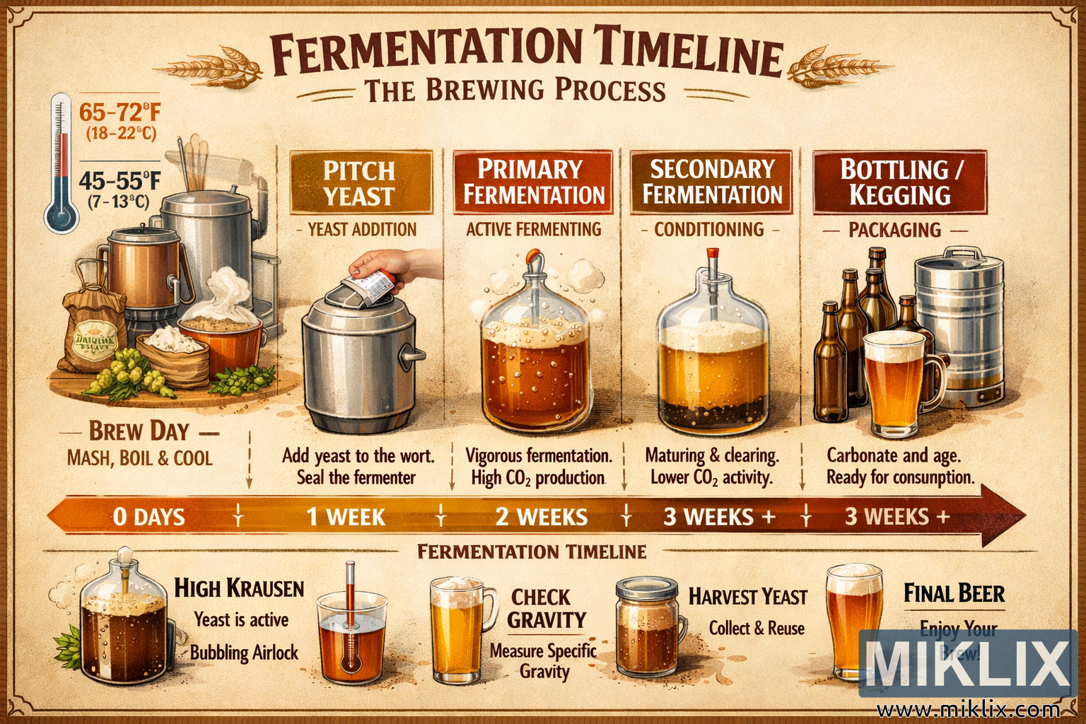Detailed illustrated fermentation timeline for brewing beer, highlighting yeast pitching, primary and secondary fermentation, conditioning, and bottling with temperature ranges and time indicators.