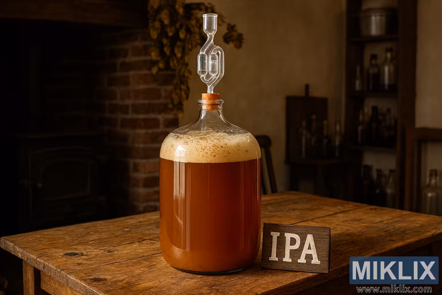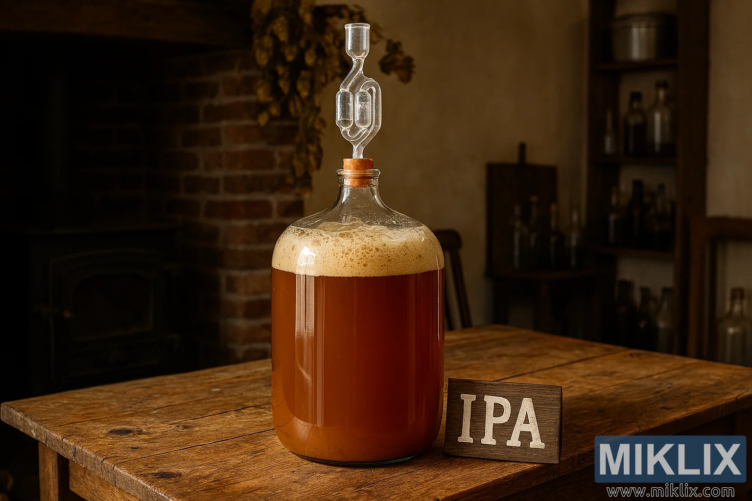 High-resolution image of IPA fermenting in a glass carboy on a rustic table in a traditional British homebrewing scene, featuring warm lighting and cottage-style details.