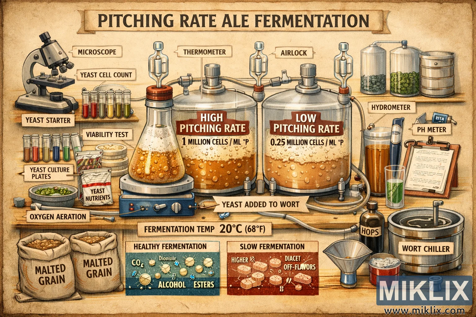 Detailed educational illustration showing how high and low yeast pitching rates affect ale fermentation, yeast health, flavor development, and brewing outcomes using scientific tools and brewing equipment.